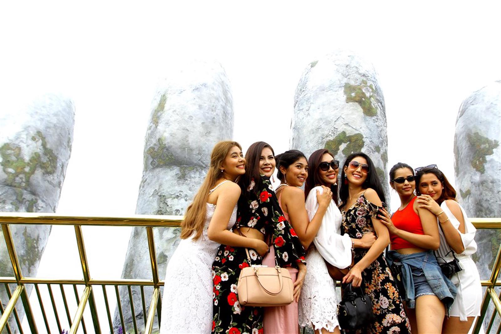 Lần đầu được chiêm ngưỡng Cầu Vàng uốn cong mềm mại tựa như dải lụa bồng bềnh vắt ngang lưng chừng núi cao kì vĩ, các hoa hậu thích thú, mê mẩn.