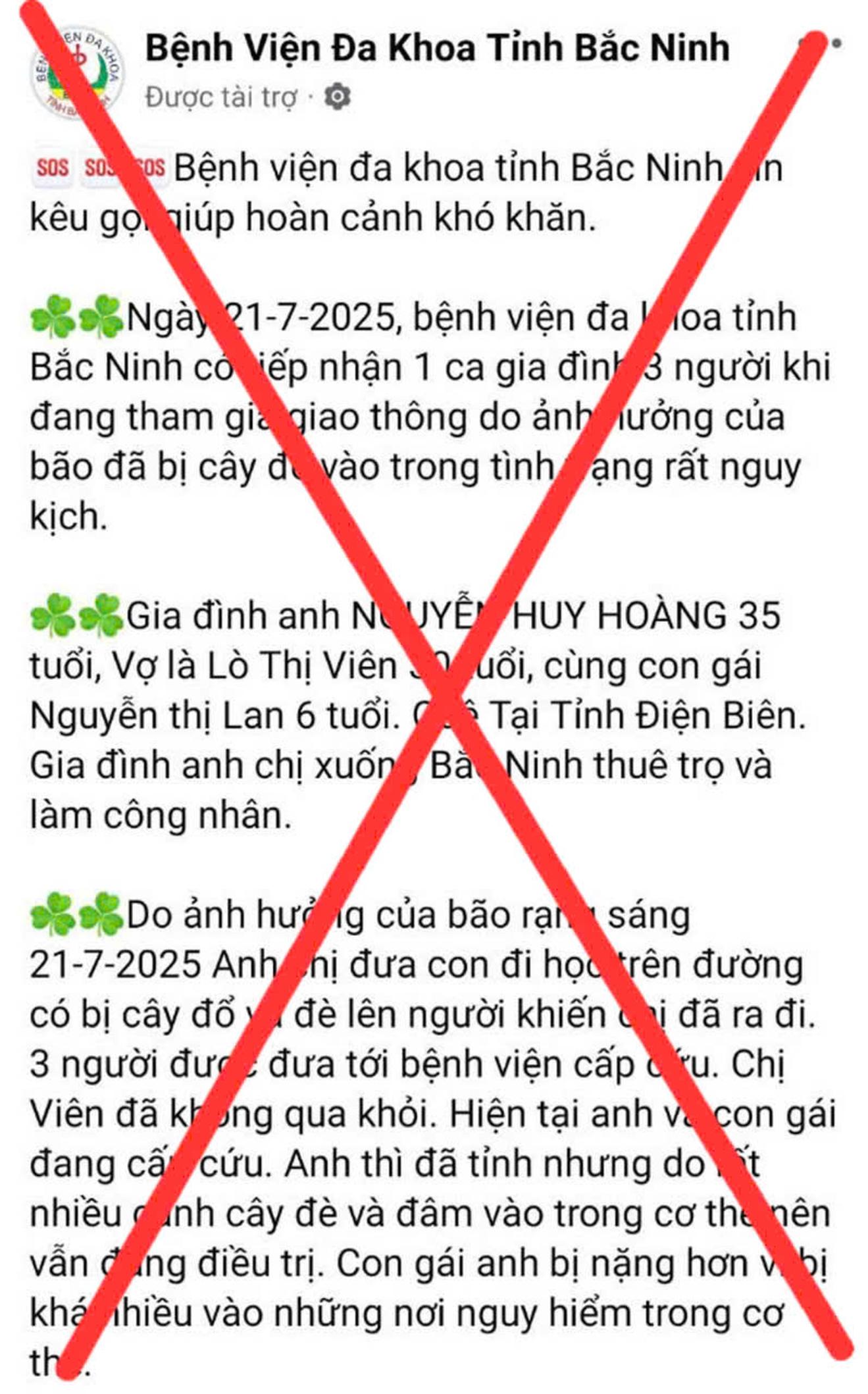 Trước thông tin xuất hiện một số đối tượng xấu mạo danh Bệnh viện Đa khoa tỉnh Bắc Ninh (cũ), nay là Bệnh viện Đa khoa tỉnh Bắc Ninh số 2 (sau khi hợp nhất) để kêu gọi ủng hộ trên mạng xã hội nhằm chiếm đoạt tiền từ các nhà hảo tâm giúp đỡ bệnh nhân bị ảnh hưởng bởi cơn bão số 3, ngày 22/7, Bệnh viện Đa khoa tỉnh Bắc Ninh số 2 cho biết bệnh viện không thực hiện bất kỳ hoạt động kêu gọi từ thiện nào thông qua tài khoản cá nhân hoặc kênh không chính thống.