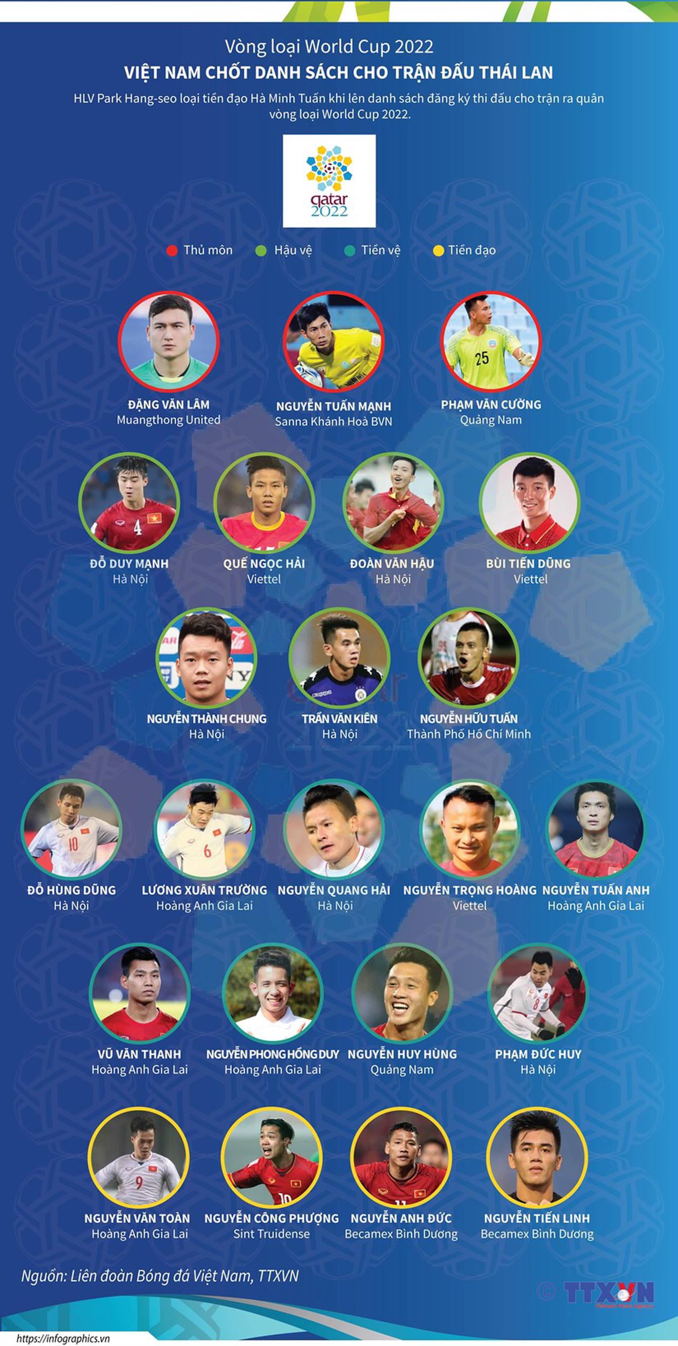 Huấn luyện viên Park Hang-seo đã chính thức chốt danh sách 23 cầu thủ đội tuyển Việt Nam sẽ đối đầu Thái Lan ở trận ra quân vòng loại World Cup 2022.