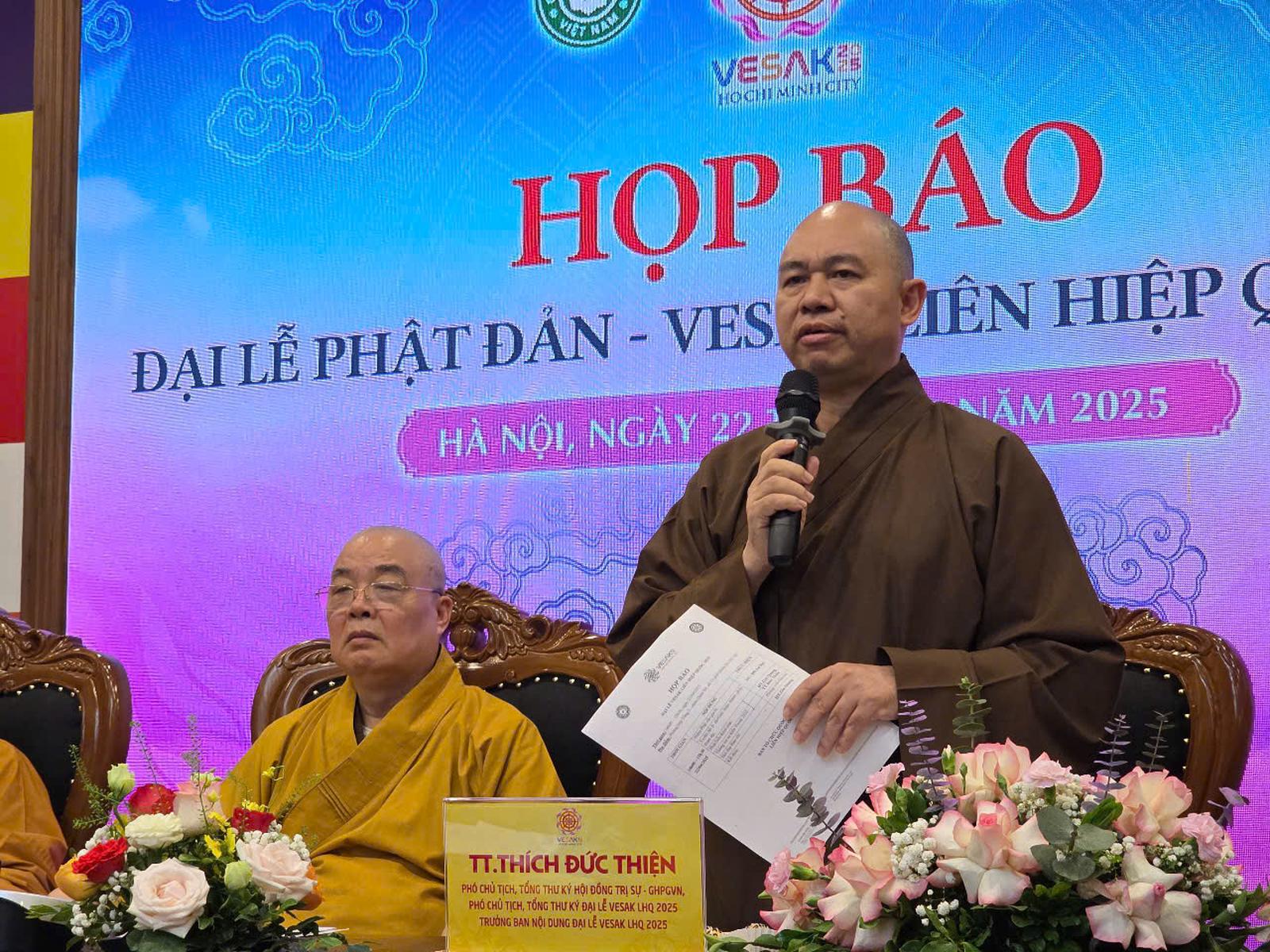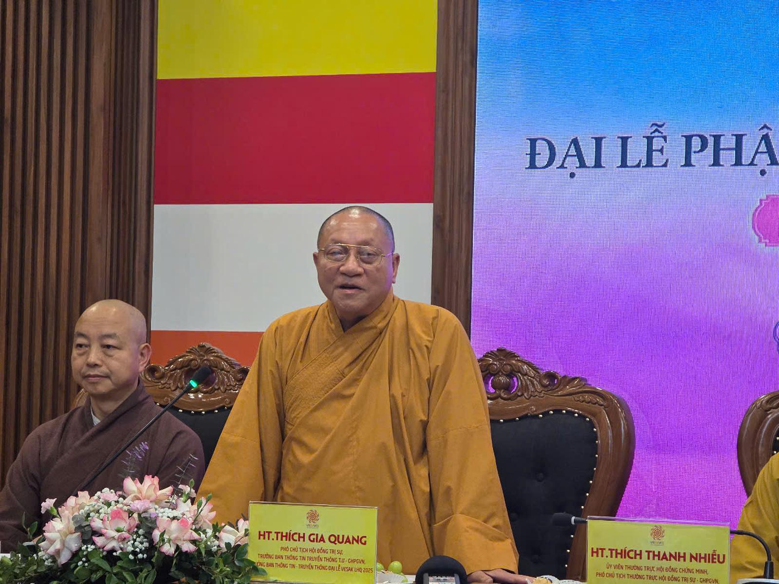 Tại họp báo, Hòa thượng Thích Gia Quang, Phó Chủ tịch Hội đồng Trị sự Trung ương Giáo hội Phật giáo Việt Nam cho biết, Đại lễ Vesak Liên hợp quốc do Việt Nam đăng cai tổ chức sẽ diễn ra từ ngày 6 đến 8/5 tại TP HCM với sự tham dự của các đoàn đại biểu đến từ 80 quốc gia và 5 vùng lãnh thổ.