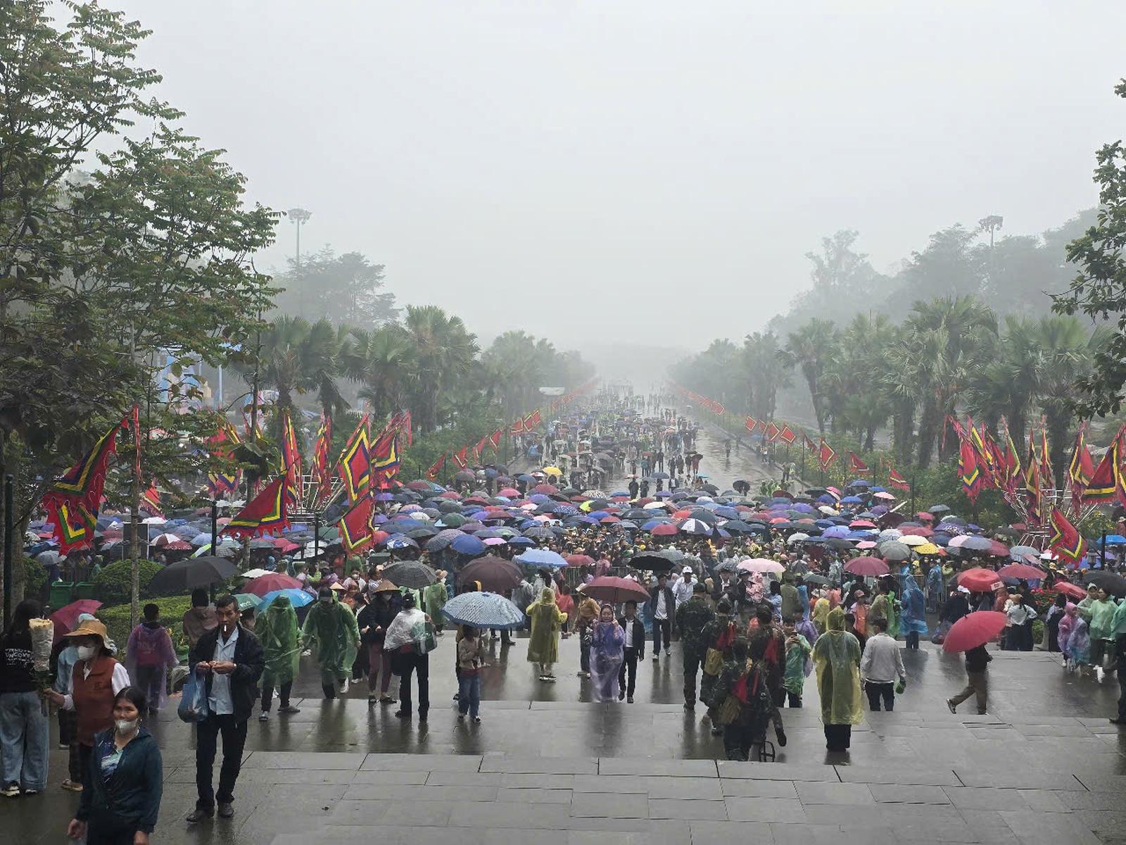 Mặc dù trời mưa nhưng hàng vạn người dân, du khách đã về Khu di tích Đền Hùng từ sớm để kính lễ. Ảnh: ND