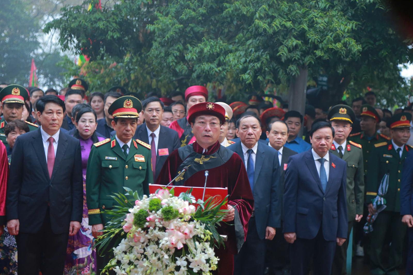 “Đảng bộ, chính quyền và Nhân dân các dân tộc tỉnh Phú Thọ vinh dự được thay mặt đồng bào cả nước và kiều bào ta ở nước ngoài gìn giữ lăng miếu tổ tiên. Chúng con nguyện đoàn kết, thống nhất ý chí và hành động; đồng tâm hiệp lực, chung sức đồng lòng, nỗ lực phấn đấu vì sự ổn định, tiến bộ, giàu mạnh, bền vững của tỉnh Phú Thọ trong không gian phát triển mới; góp phần xứng đáng vào sự nghiệp xây dựng đất nước trong kỷ nguyên vươn mình của dân tộc. Cùng chăm lo bảo tồn, tôn tạo nơi thờ tự để con cháu Lạc Hồng đời đời thờ phụng; để cùng tự hào: Từ Đền Hùng nhìn ra cả nước và từ cả nước hướng về Đền Hùng", Chủ tịch UBND tỉnh Phú Thọ khẳng định.
