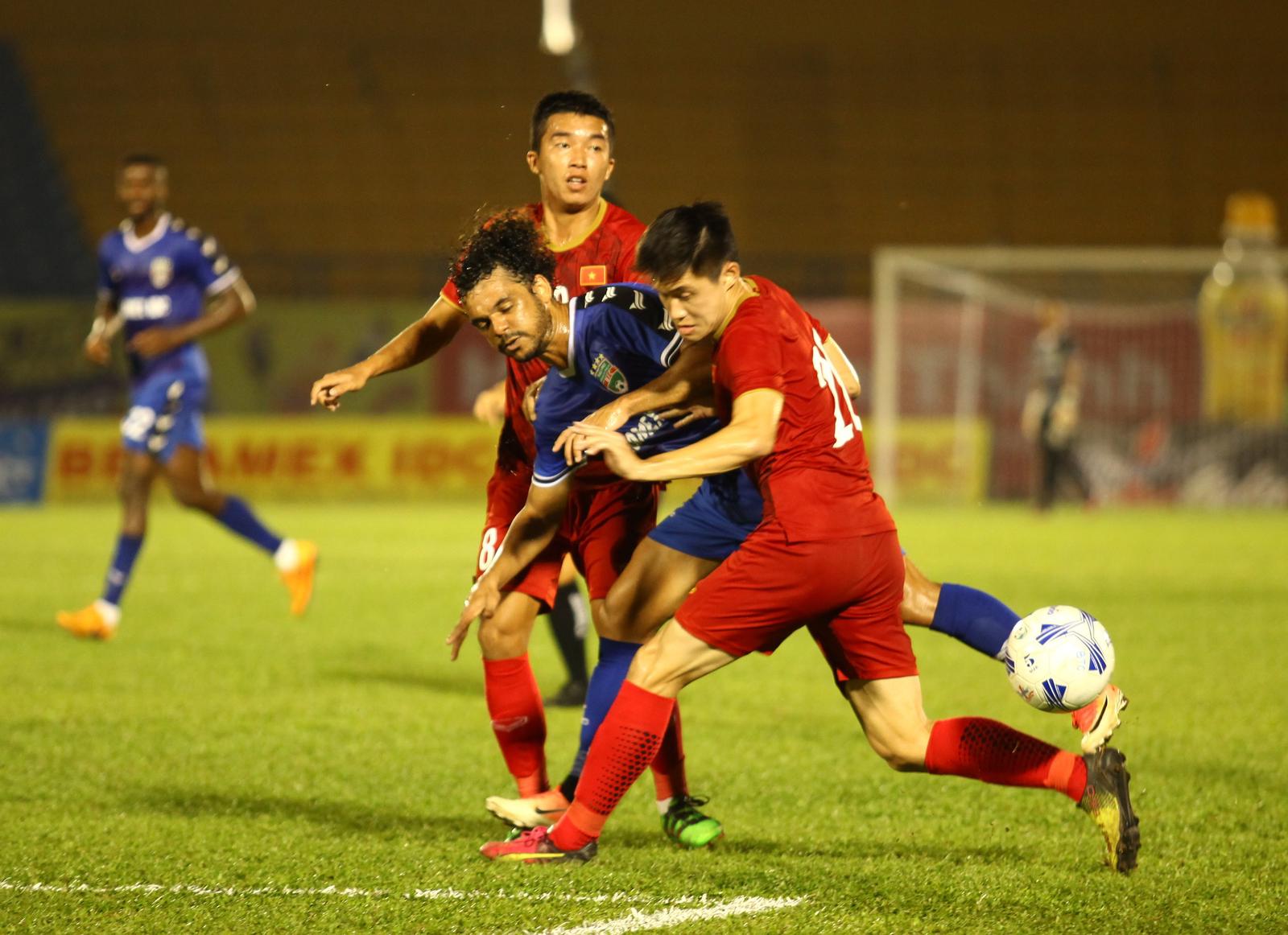 Các cầu thủ B.Bình Dương (xanh) cho thấy sự bản lĩnh trước các cầu thủ trẻ U20 Việt Nam
