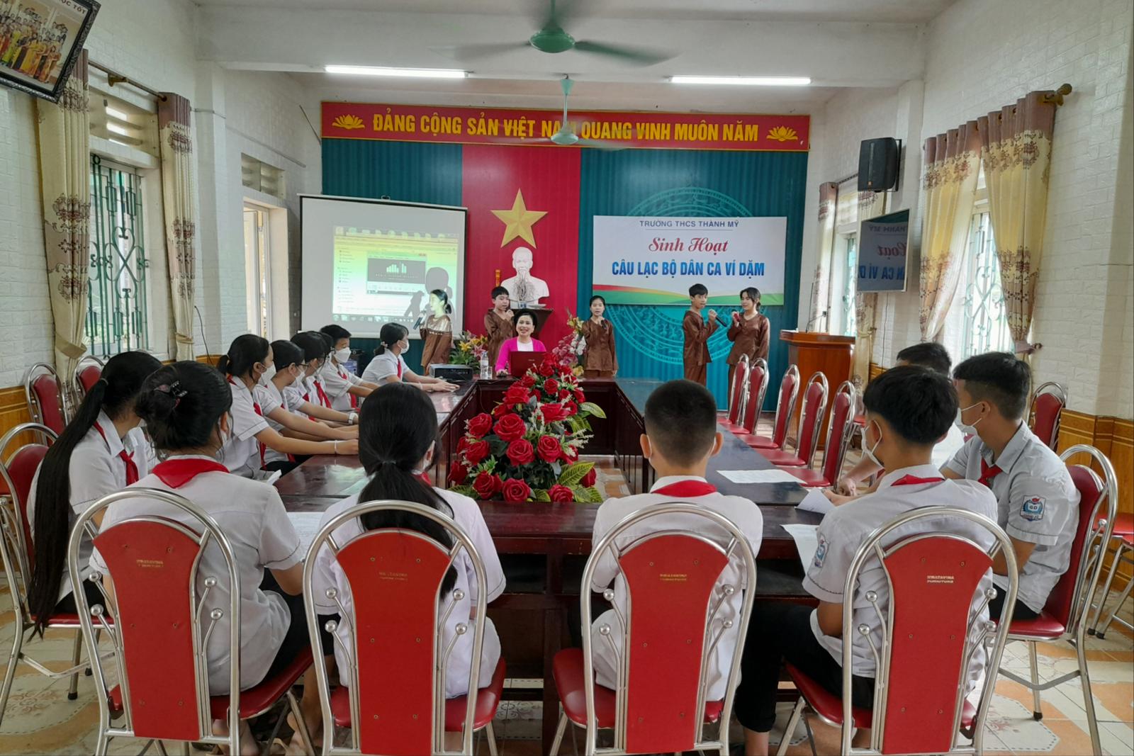 Cô giáo Phan Thị Thuỳ Diễm và các em học sinh Trường THCS Thành Mỹ trong một buổi sinh hoạt Câu lạc bộ Dân ca ví, giặm. Ảnh: Thùy Diễm