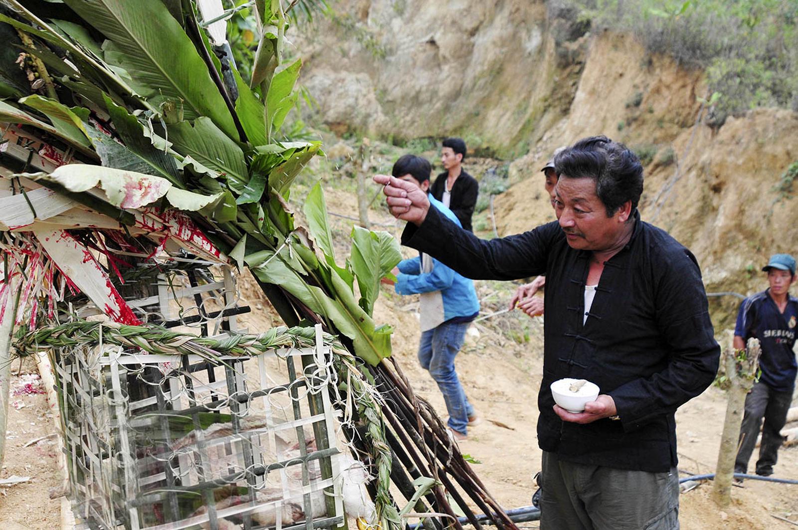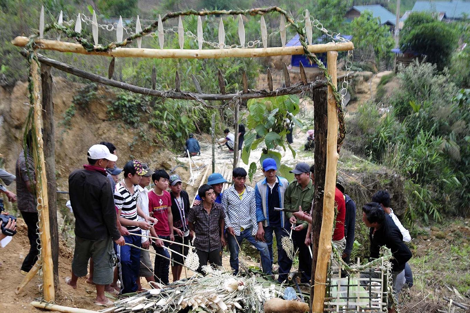 Hoàn tất quá trình dựng cổng cấm, thầy cúng hướng dẫn mọi người thực hiện các nghi thức tượng trưng, nhằm ngăn chặn các tai họa, xui xẻo xâm nhập vào bản làng.
