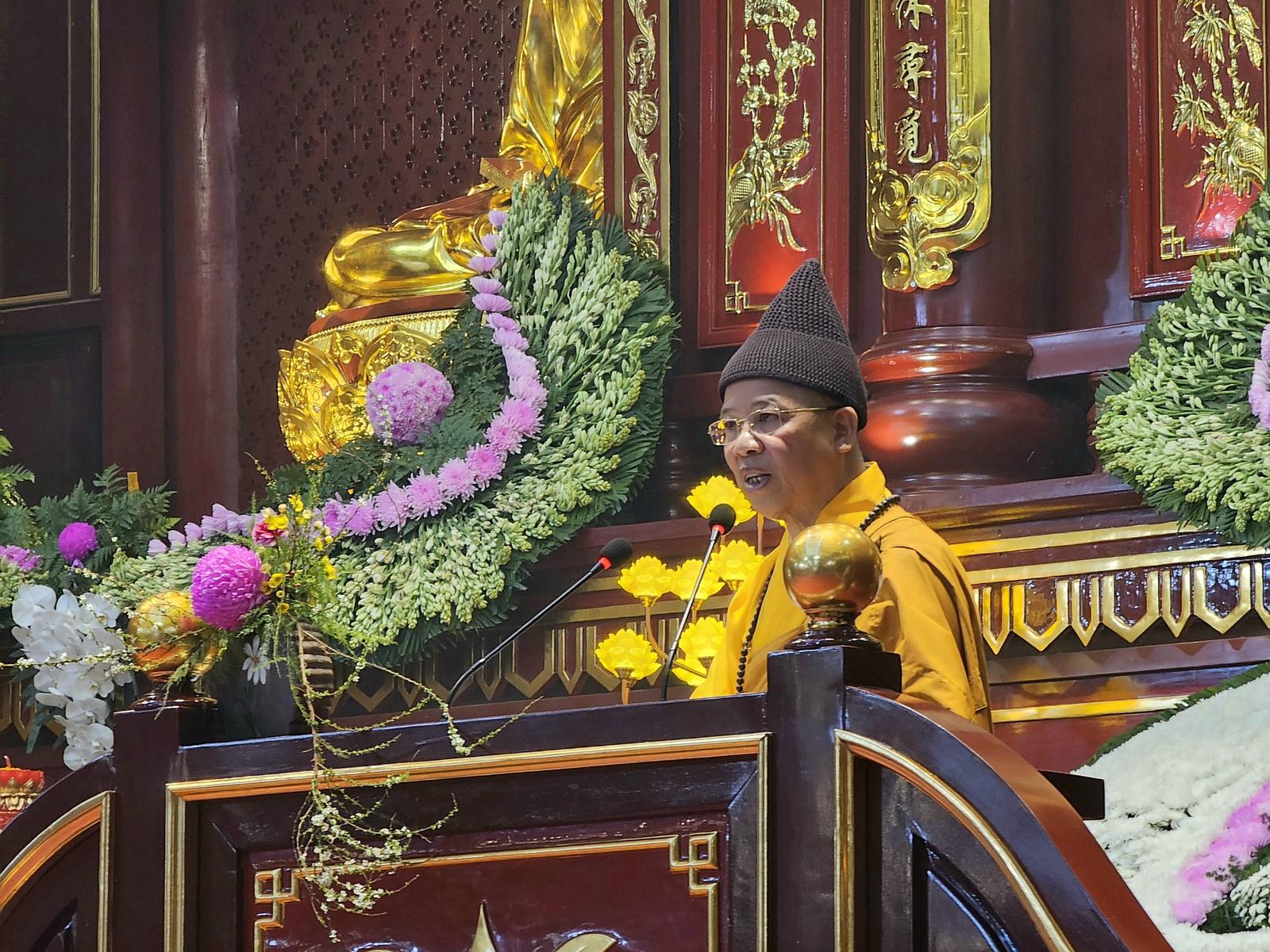 Thượng toạ Thích Đạo Hiển, Chánh Thư ký Giáo hội Phật giáo Quảng Ninh đọc văn tưởng niệm, ôn lại sự nghiệp và tôn vinh công đức to lớn của Đức vua - Phật hoàng Trần Nhân Tông, người đã trực tiếp hai lần lãnh đạo quân dân Ðại Việt thời nhà Trần đánh bại quân xâm lược Mông Nguyên.