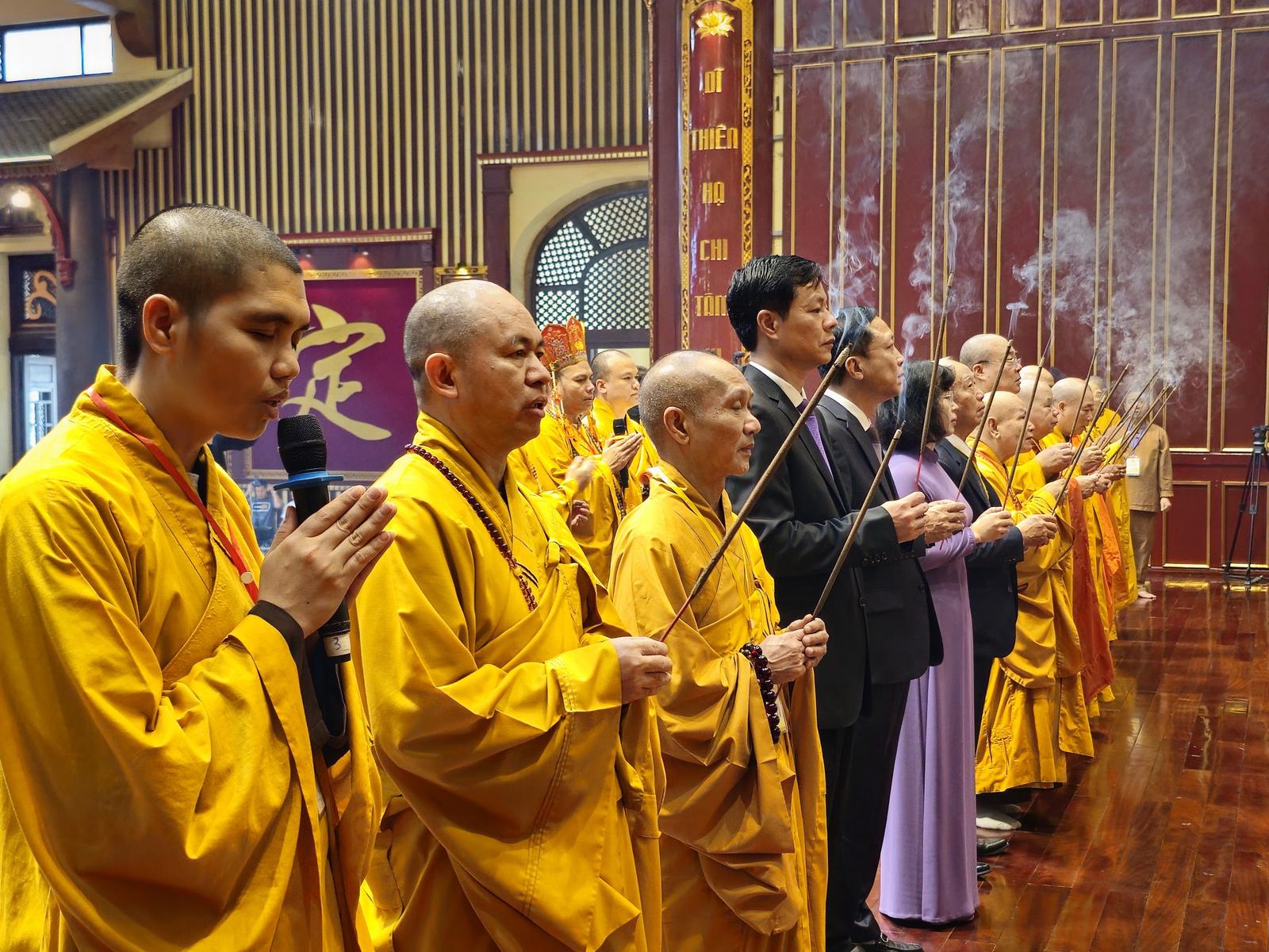 Chư tôn đức, giáo phẩm Trung ương Giáo hội Phật giáo Việt Nam thành kính dâng hương tưởng niệm Đức vua - Phật hoàng Trần Nhân Tông. Ảnh: TV