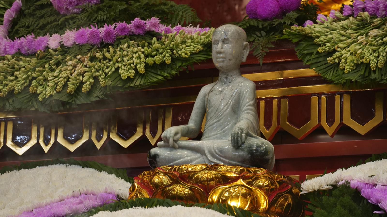 Bức tượng Phật hoàng Trần Nhân Tông được chế tác bằng đá ngọc phỉ thúy với kích thước bằng kích thước với phiên bản của tượng Phật Hoàng trong Tháp tổ trên non thiêng Yên Tử. Ảnh: TV