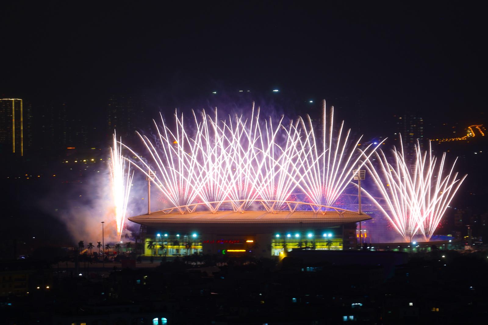 Trong đó, 950 giàn phun pháo hoa và 4.400 ống pháo hoa hỏa thuật được lắp đặt trực tiếp trên mái nhà và hai bên cánh khán đài B theo địa hình vòng cung. Bên ngoài sân là trận địa 4.600 pháo hoa nổ tầm cao được bố trí từ nửa đường Lê Đức Thọ qua cột đồng hồ đến bãi đất trống trước Cung Thể thao dưới nước, phường Từ Liêm.