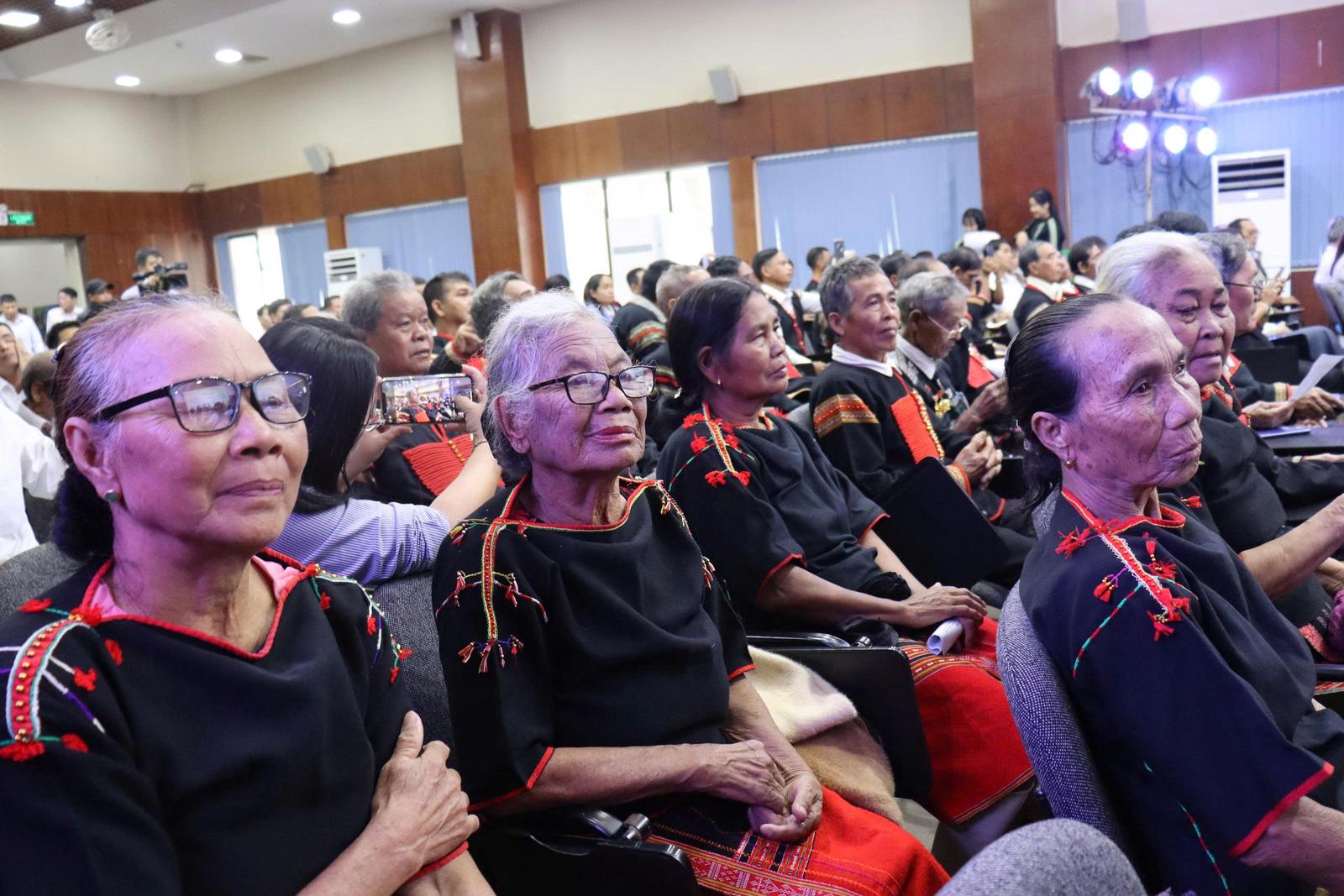 Các nghệ nhân đồng bào dân tộc thiểu số tham dự Hội nghị Tổng kết 20 năm bảo tồn và phát huy di sản văn hóa cồng chiêng tại Đắk Lắk. Ảnh: TA