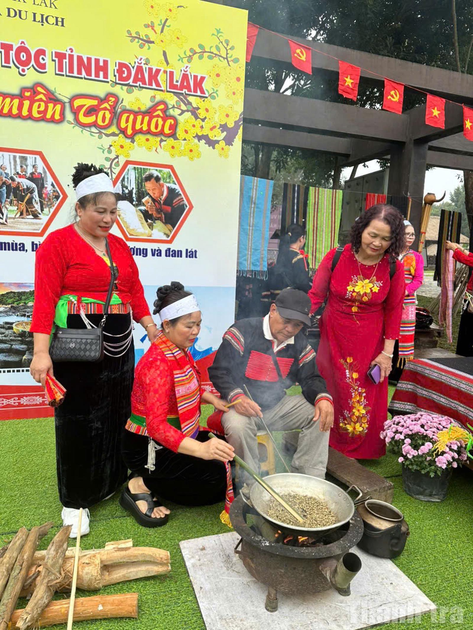 Đặc biệt, không gian trình diễn cà phê truyền thống thu hút sự quan tâm lớn của du khách Thủ đô. Từ khâu lựa chọn hạt, rang xay trên bếp củi, giã thủ công đến phương thức lọc tự nhiên của người đồng bào. Toàn bộ quy trình được giới thiệu sinh động, góp phần tái hiện rõ nét văn hóa cà phê đặc trưng của Đắk Lắk – “thủ phủ” cà phê của cả nước.