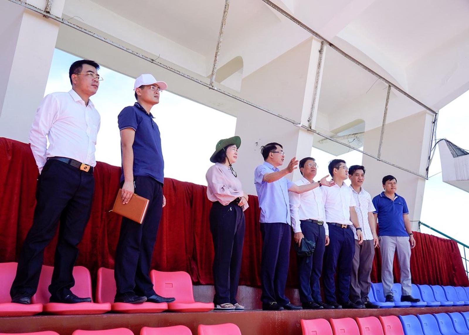 Phó Chủ tịch UBND thành phố Lê Khắc Nam (đứng thứ 4 từ bên trái sang) cùng lãnh đạo thành phố, quận Đồ Sơn kiểm tra tại sân vận động trung tâm. Ảnh: ĐT