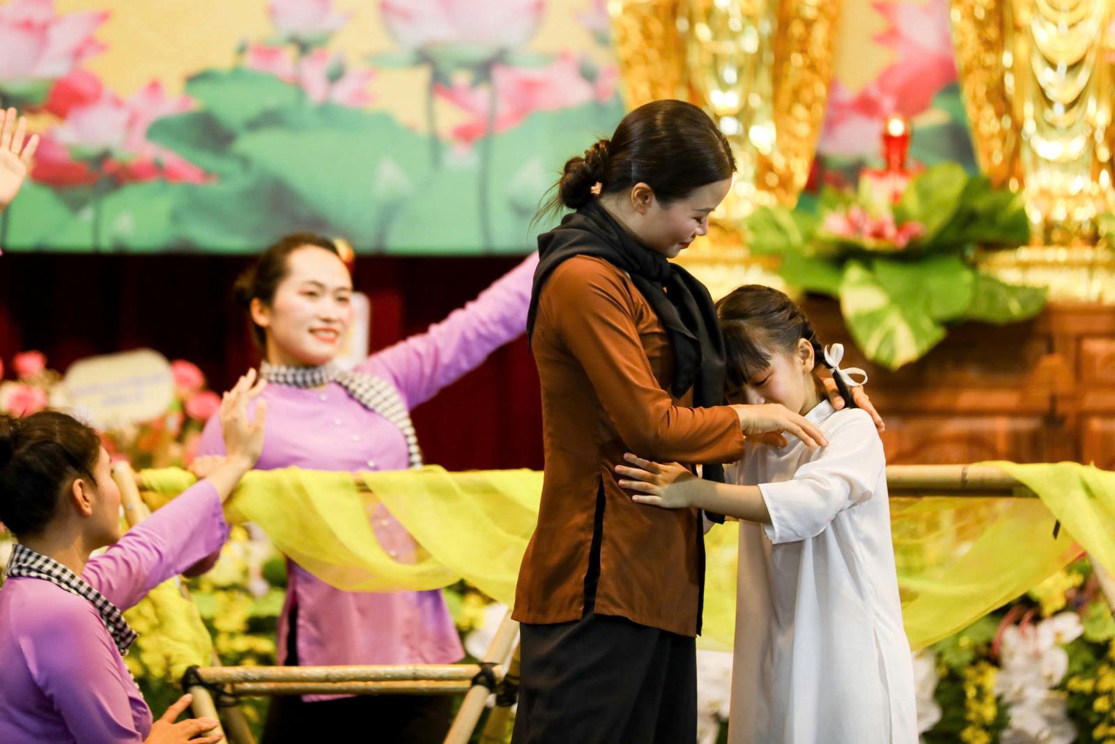 Tiết mục: Gánh mẹ do đoàn Phật tử Từ Tâm trình bày khiến nhiều người rưng rưng nước mắt. Ảnh: TV