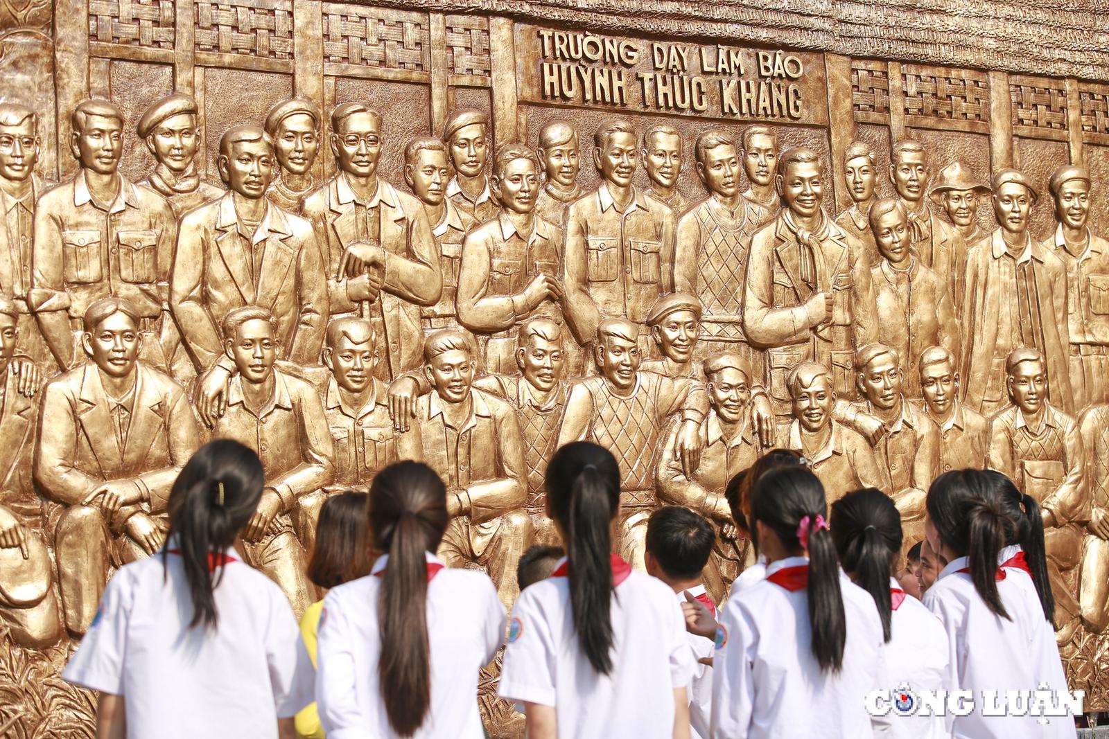 Các em học sinh sau khi được giáo viên hướng dẫn đến tham quan, chăm chú lắng nghe lịch sử về ngôi trường dạy làm báo Huỳnh Thúc Kháng.