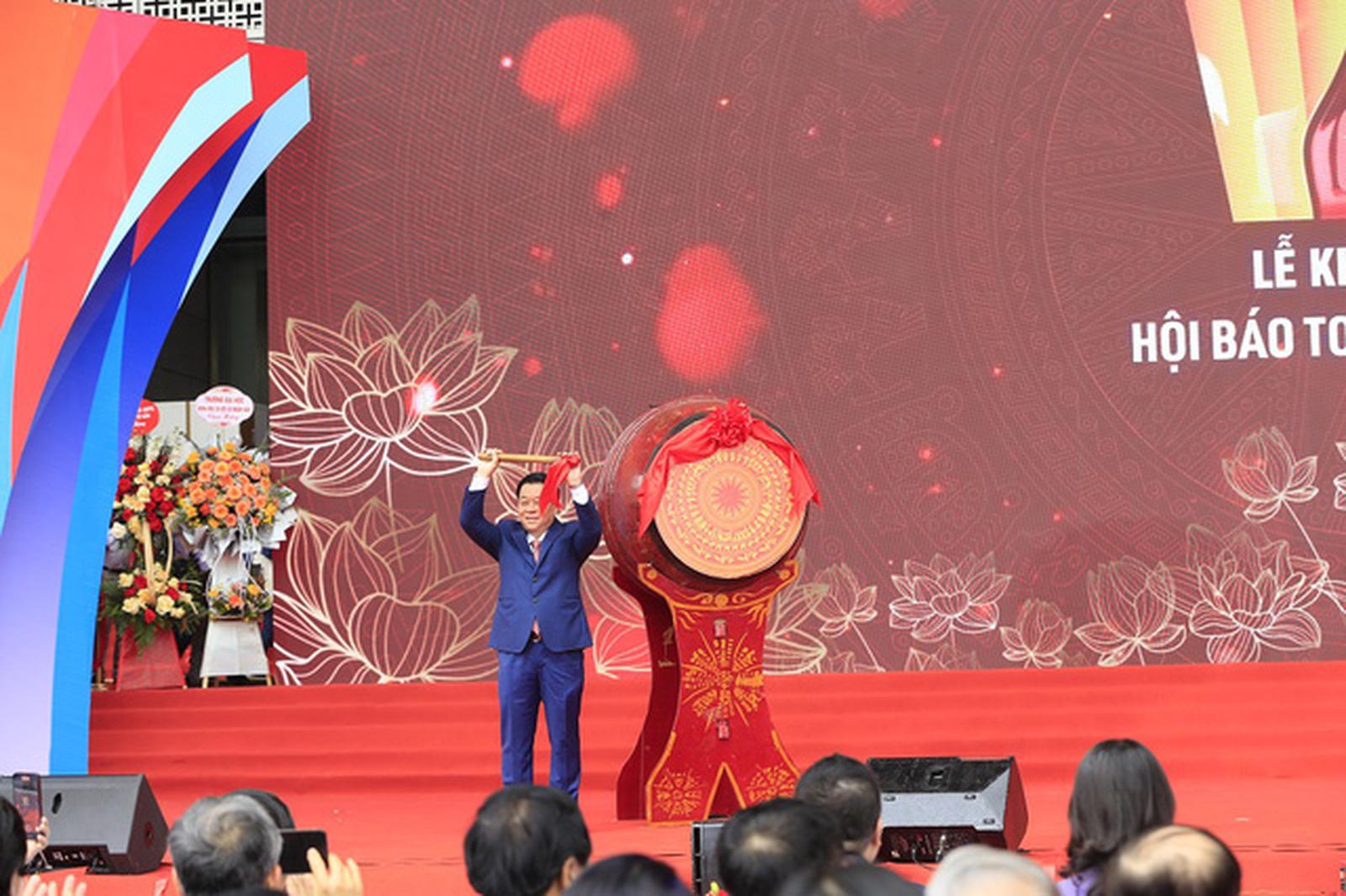 Bí thư Trung ương Đảng, Trưởng Ban Tuyên giáo Trung ương Nguyễn Trọng Nghĩa đánh trống khai mạc. Ảnh: TH