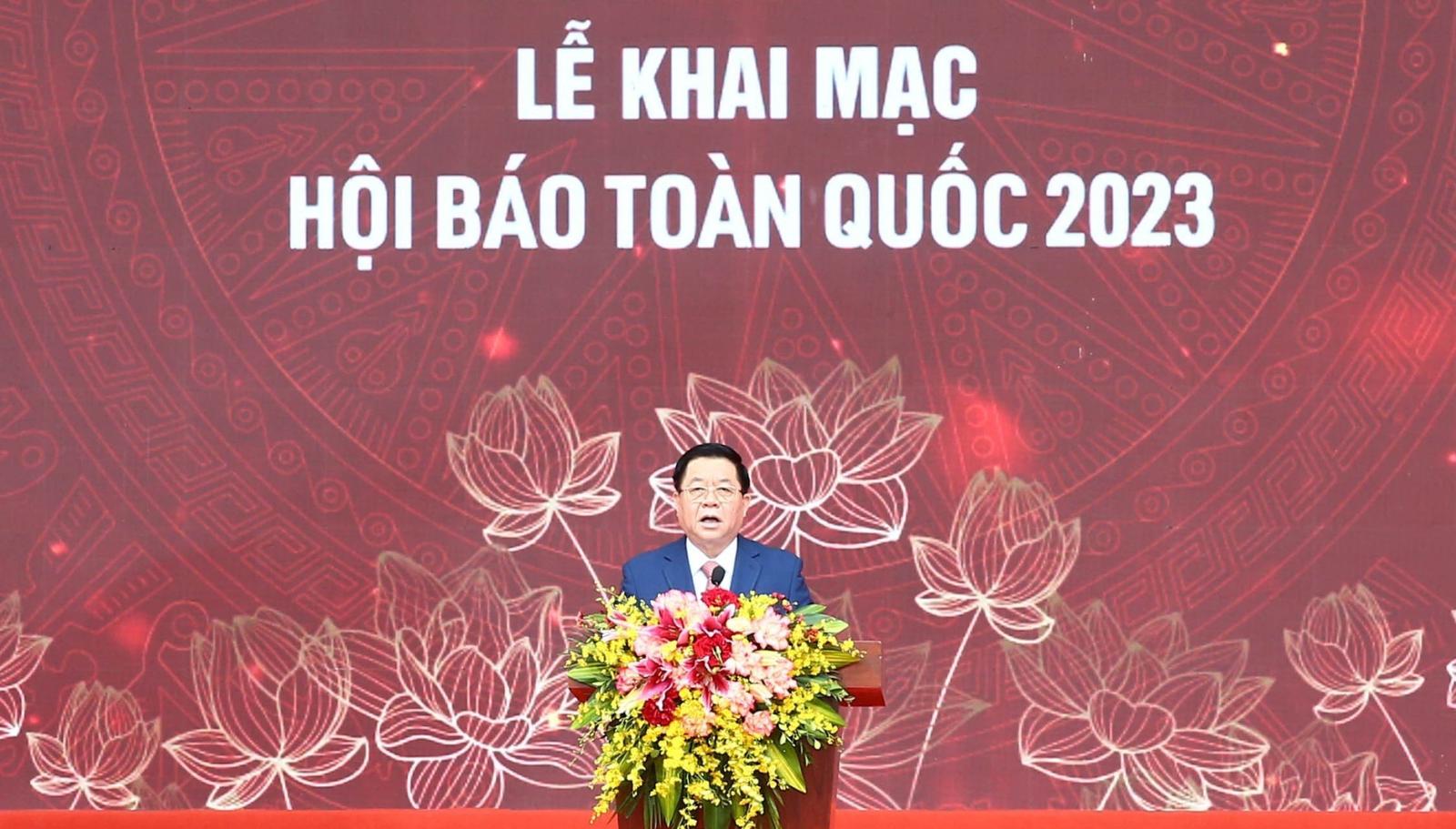 Trưởng Ban Tuyên giáo Trung ương Nguyễn Trọng Nghĩa phát biểu tại Hội Báo toàn quốc 2023. Ảnh: TH