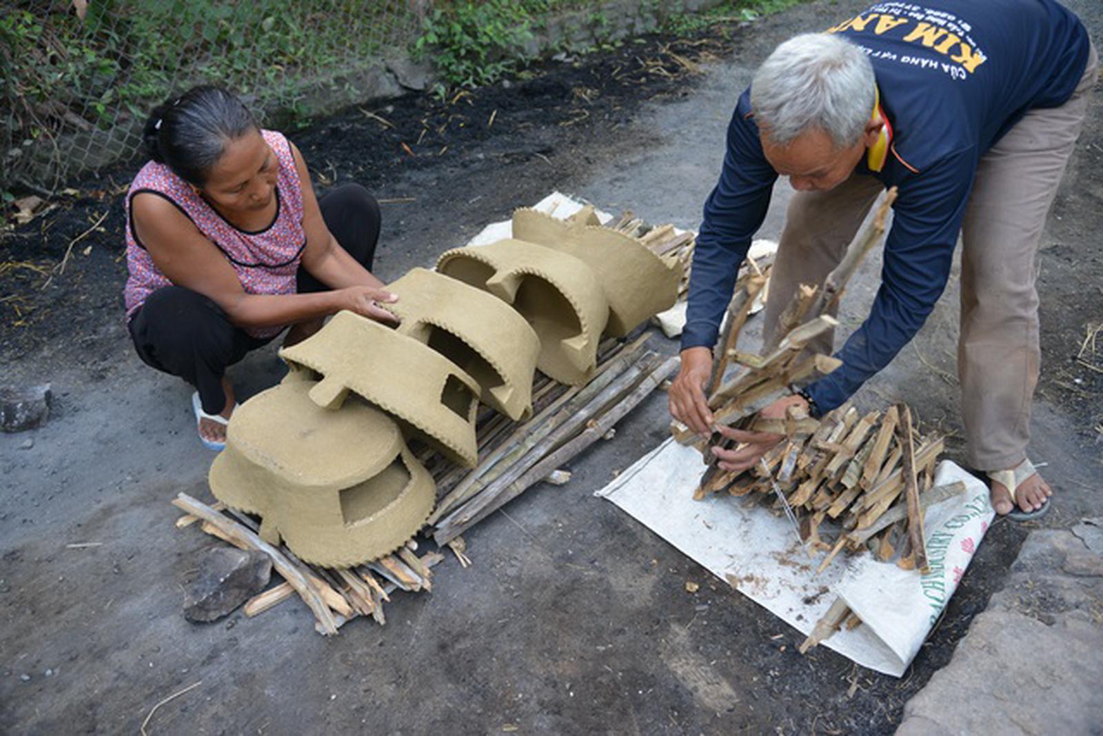 Đất sau khi được mang về sẽ được ủ, rồi tưới nước làm mềm, lấy cây đập, nhồi đất, sau đó mới nặn thành hình các sản phẩm và tạo các họa tiết lên sản phẩm. Những sản phẩm sau khi được tạo kiểu dáng hoàn chỉnh sẽ đem phơi từ 3 - 5 ngày, sau đó đem nung bằng rơm.