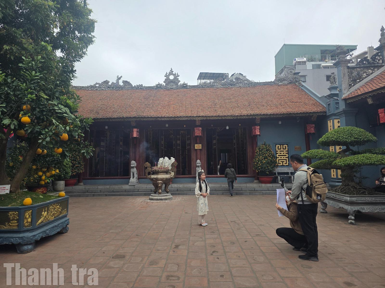 Đặc biệt, vẻ đẹp kiến trúc cổ kính của đền cũng thu hút nhiều du khách đến chụp ảnh lưu niệm cùng tà áo dài truyền thống.