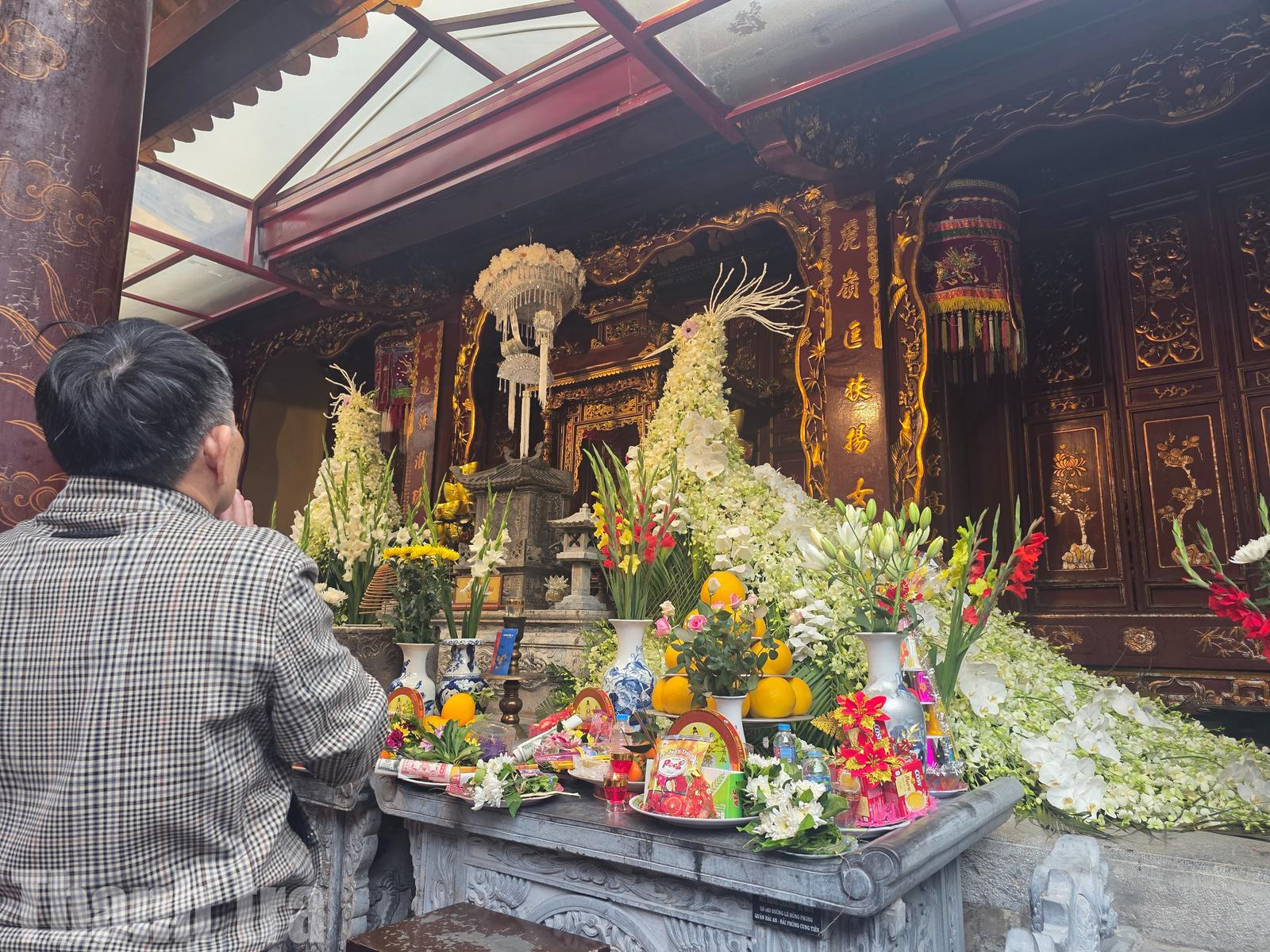 Không gian trang nghiêm, thanh tịnh với mùi hương trầm và sắc hoa xuân giúp lòng người lắng lại, rũ bỏ những bộn bề của năm cũ.
