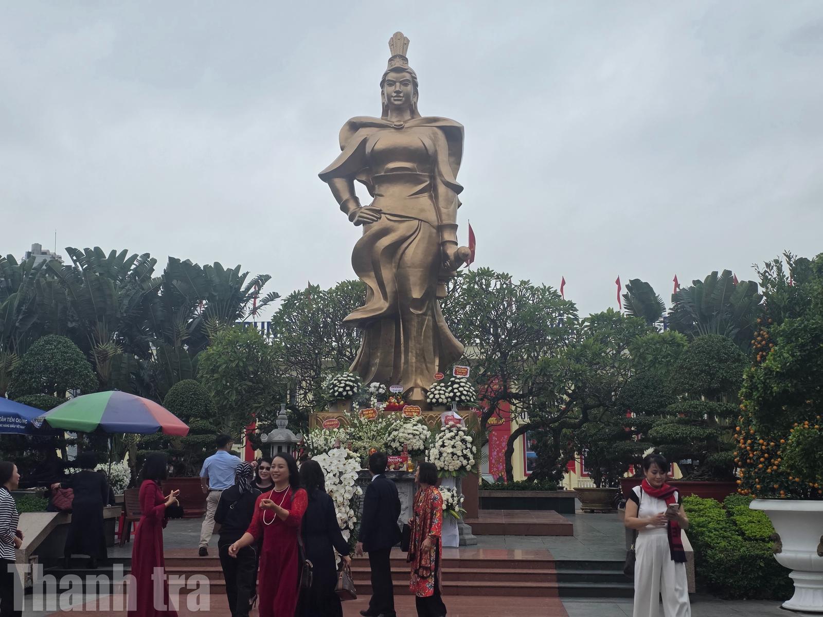 Du khách đến đây không khỏi trầm trồ trước nghệ thuật chạm khắc gỗ, đá tinh xảo với các đề tài tứ linh (long, ly, quy, phượng), tứ quý (tùng, cúc, trúc, mai) cùng các công trình bề thế, uy nghi như tòa tiền bái, hậu cung hay tấm bia đá lớn tạc tiểu sử Nữ tướng.