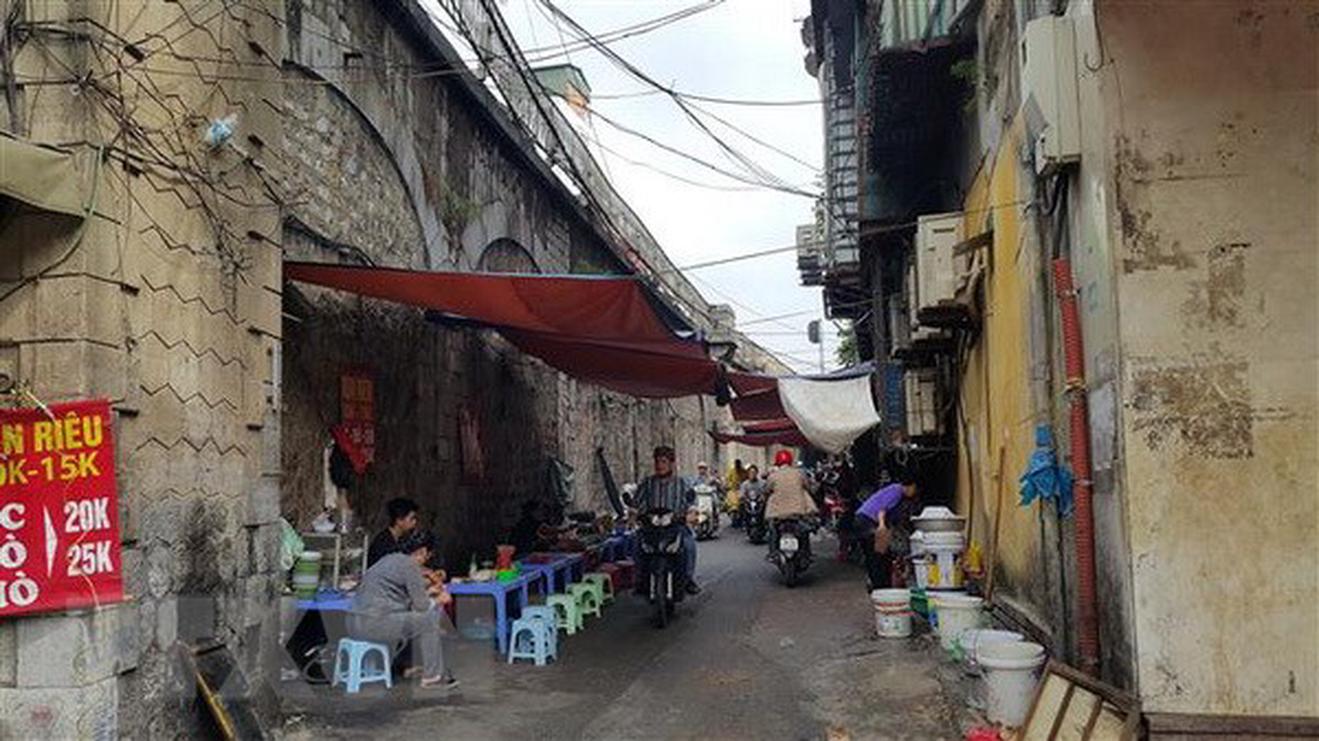 Phố Gầm Cầu đoạn nhìn từ phố Hàng Cót với 6 vòm cầu sẽ được đục thông. (Ảnh: Đinh Thuận/TTXVN)