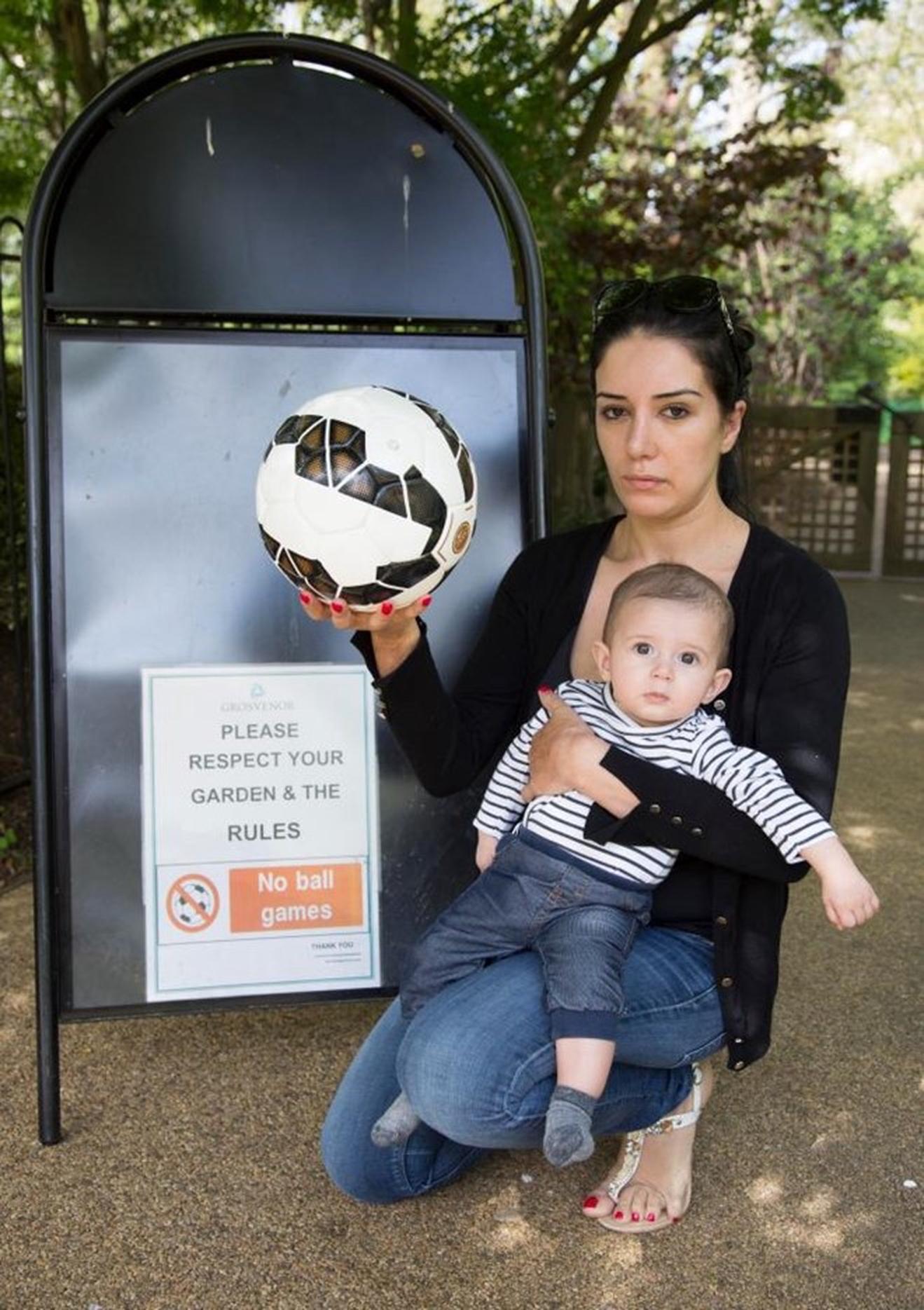 Bà mẹ Victoria cùng quả bóng bay trúng đầu con chị. Bên cạnh là tấm biển cấm chơi bóng.