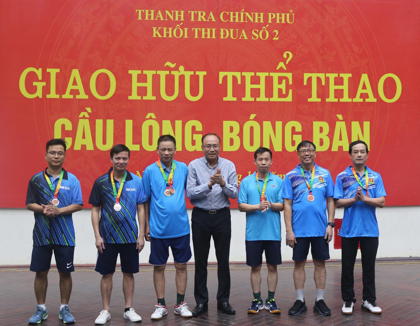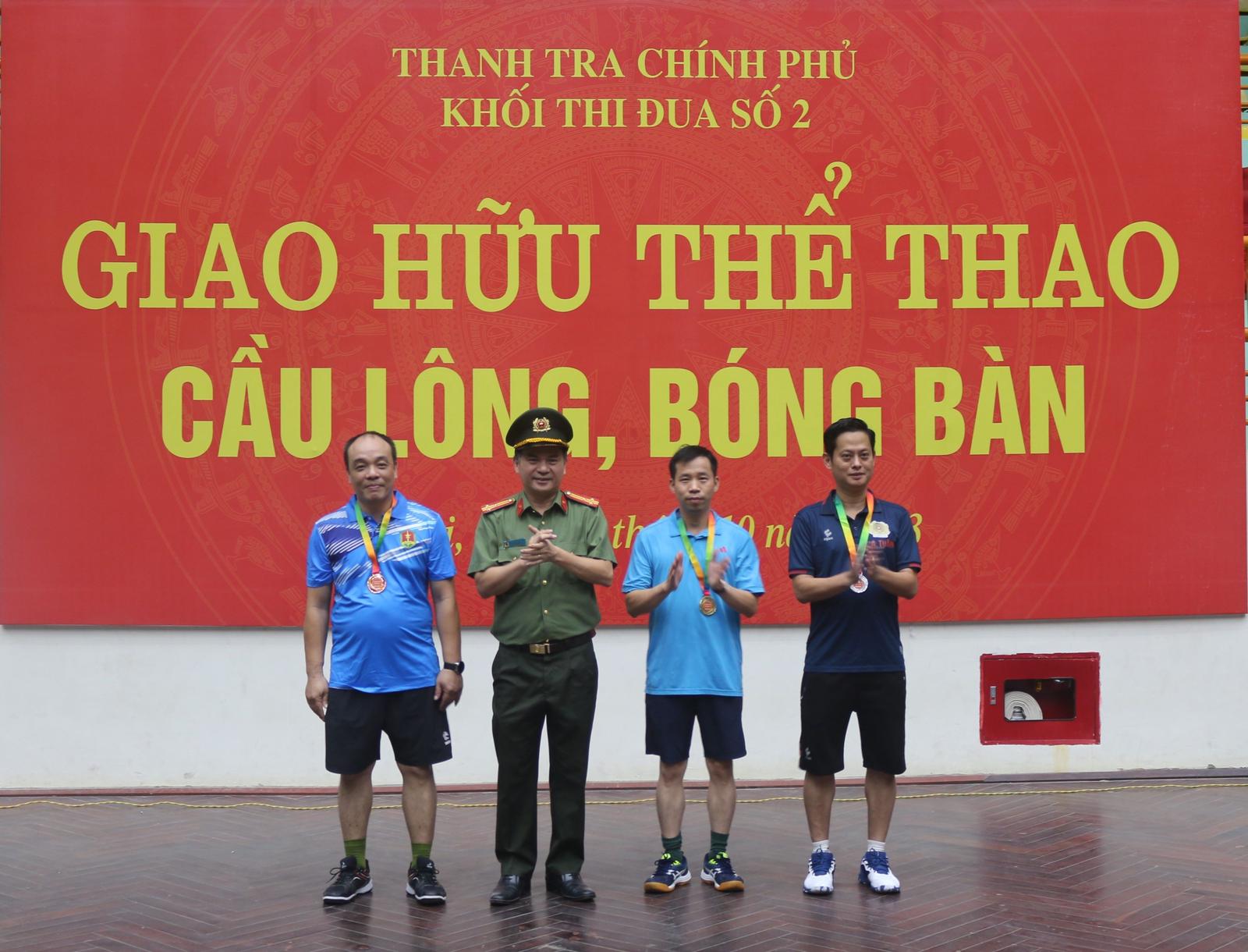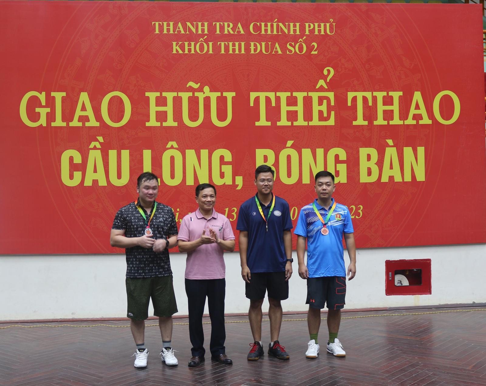 Ông Phạm Văn Tình, Phó Chánh Thanh tra Bộ Tài chính trao huy chương cho các VĐV đạt thứ hạng nhất, nhì, ba nội dung đôi nam môn bóng bàn. Ảnh: Hoàng Nam