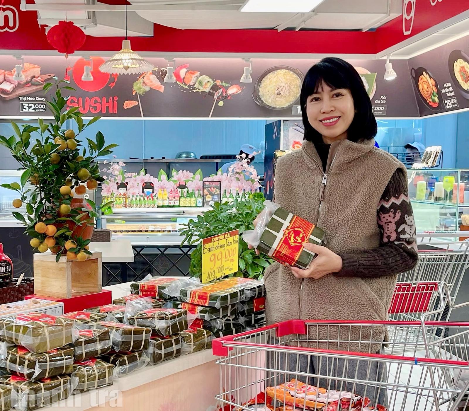 Cách xa những gian bếp quê ấy, giữa không gian rộn ràng của một siêu thị tại Thủ đô, chị Phạm Thanh Nga (phường Cầu Giấy, Hà Nội) đang lựa chọn những cặp bánh chưng bày ngay ngắn trên kệ hàng. Bánh vuông vắn đã được hút chân không, dán nhãn đầy đủ và đóng gói cẩn thận, sẵn sàng cho mâm cỗ ngày Tết.