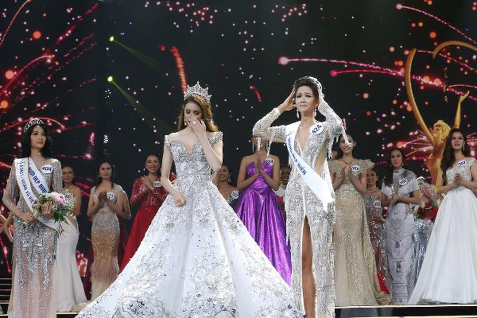 Giây phút chuyển giao giữa các người đẹp đã có những giọt nước mắt rơi xuống. Hoa hậu Phạm Hương đã hoàn thành nhiệm kỳ xuất sắc, trao lại trọng trách lớn lao cho tân Hoa hậu H’Hen Niê bằng những hình ảnh đẹp đầy xúc động trên sân khấu. Ảnh: Đại Ngô