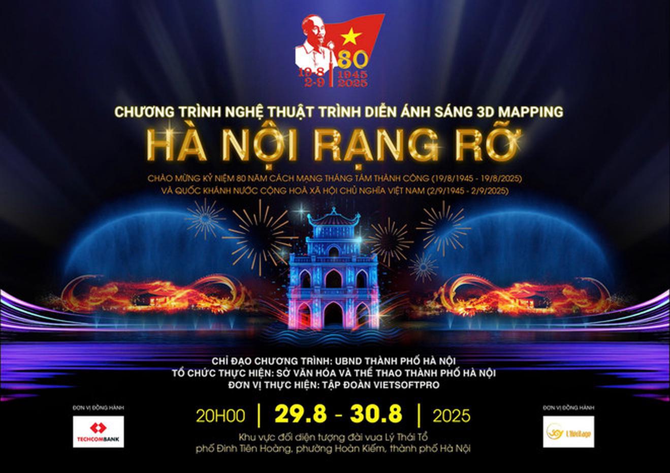 Tiếp nối các hoạt động kỷ niệm, chương trình “Hà Nội rạng rỡ” sẽ diễn ra từ 20h00 đến 22h00 ngày 29 và 30/8/2025 tại khu vực hồ Hoàn Kiếm, với màn trình diễn ánh sáng 3D Mapping trên Tháp Rùa kết hợp hệ thống màn nước độc đáo.