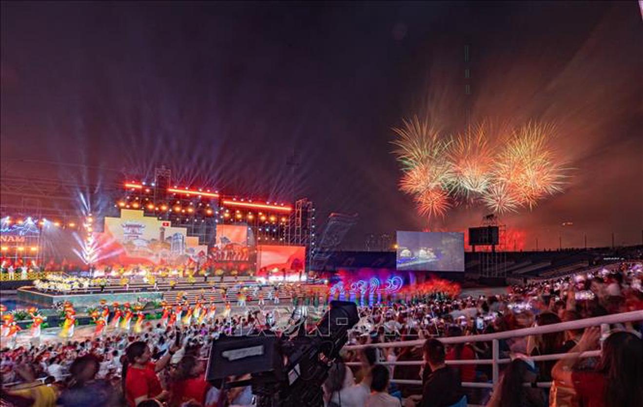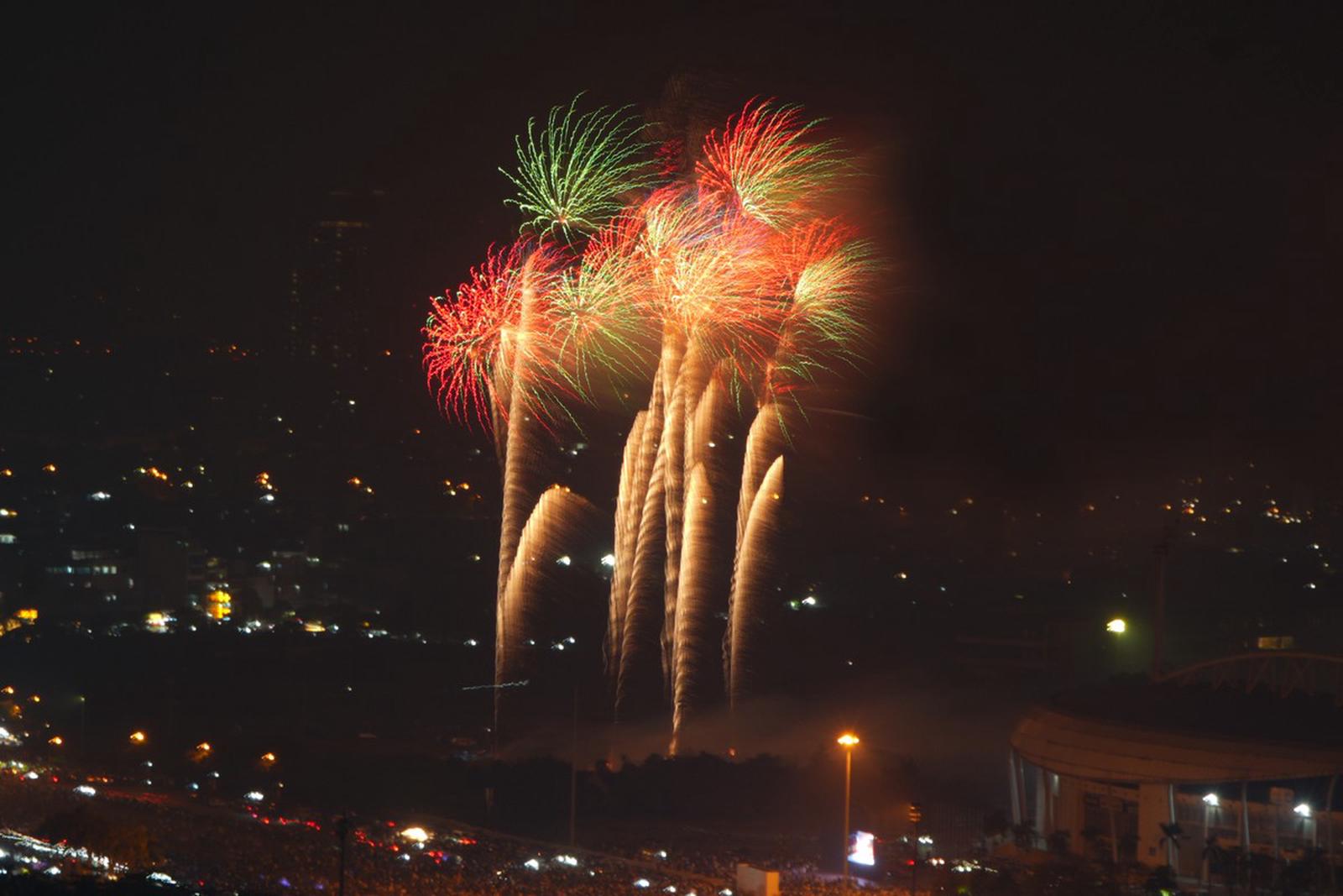 Màn pháo hoa chào mừng tại khu vực đường đua F1 rực sáng bầu trời Sân vận động quốc gia Mỹ Đình. Ảnh: TTXVN