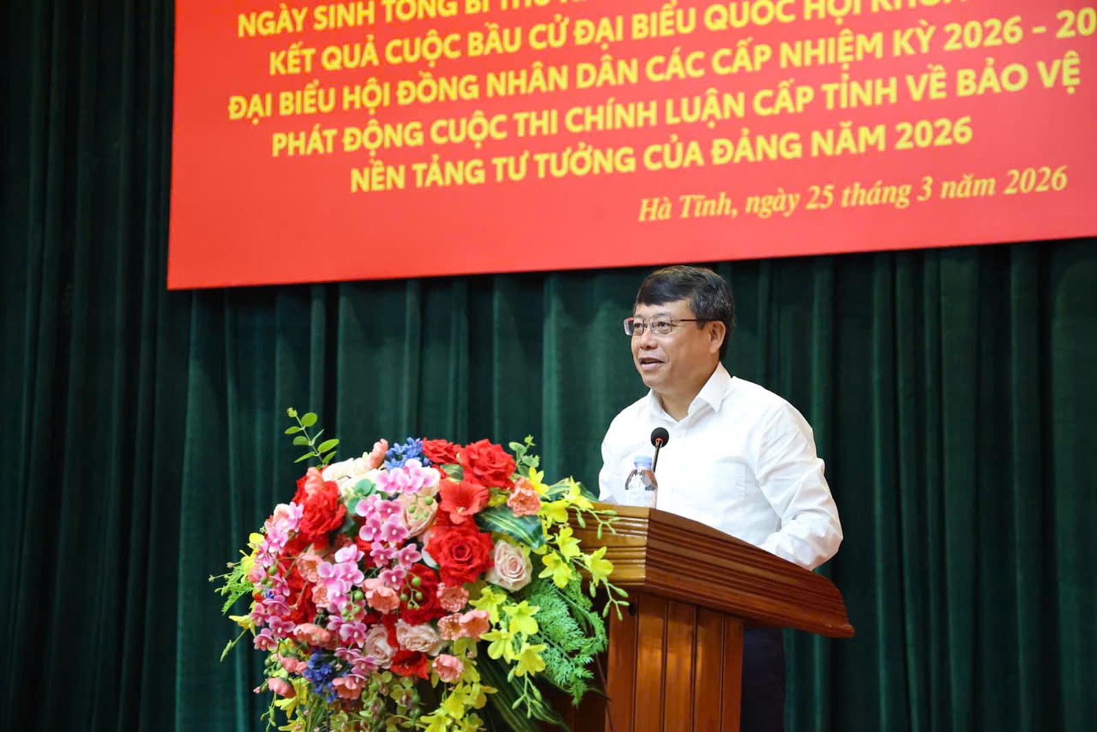 (Thanh tra) - Sáng 25/3, Tỉnh ủy Hà Tĩnh tổ chức Hội nghị Báo cáo viên Tỉnh ủy và họp báo tuyên truyền các hoạt động kỷ niệm 120 năm Ngày sinh Tổng Bí thư Hà Huy Tập (24/4/1906 – 24/4/2026); thông tin kết quả bầu cử đại biểu Quốc hội khóa XVI và đại biểu HĐND các cấp nhiệm kỳ 2026 – 2031; đồng thời phát động Cuộc thi chính luận cấp tỉnh về bảo vệ nền tảng tư tưởng của Đảng năm 2026.
