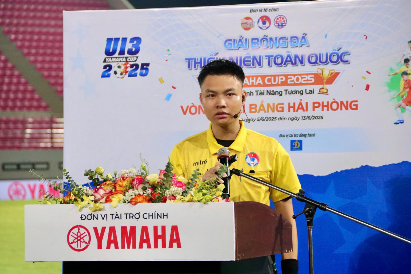 Trọng tài tuyên hệ tại Lễ khai mạc vòng loại giải Bóng đá Thiếu niên U13 toàn quốc năm 2025. Ảnh: KT
