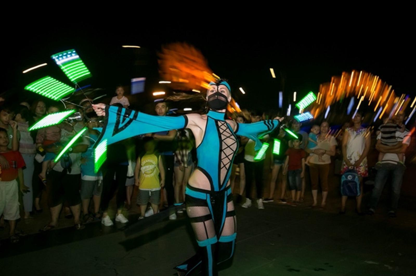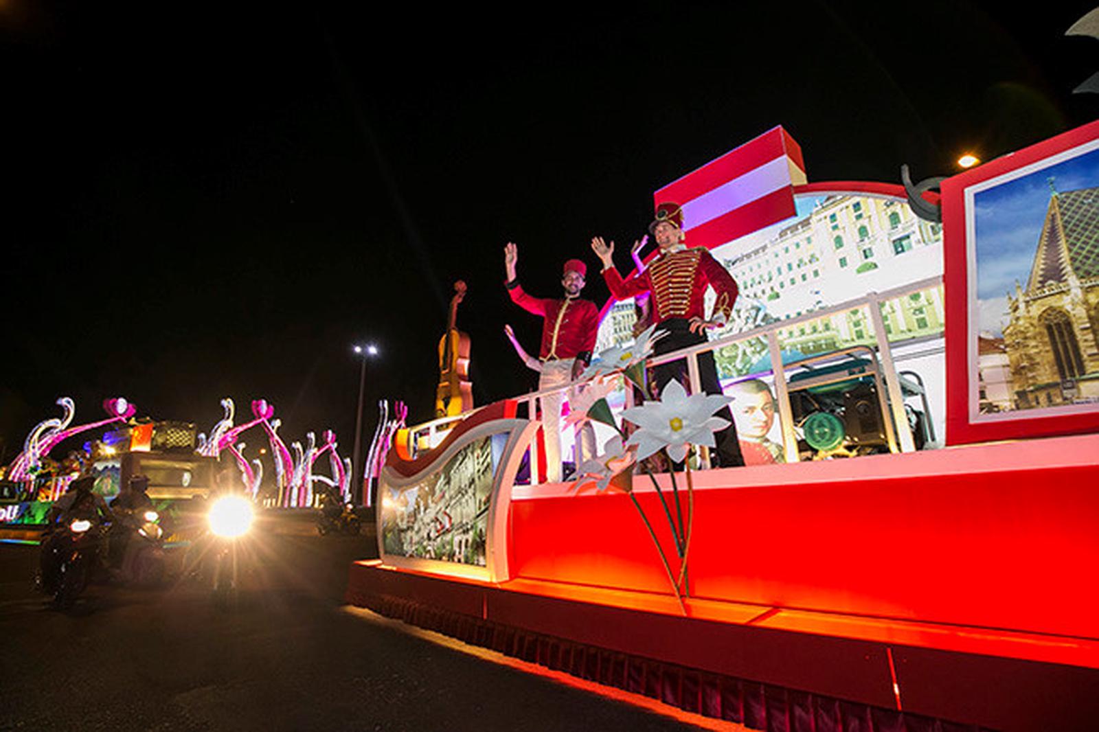 Bắt đầu từ 19h tối, dòng người nối theo đoàn xe mô hình diễu hành của lễ hội ngày càng đông. Những màn trình diễn nghệ thuật tưng bừng của các nghệ sĩ trong nước và quốc tế trên các xe mô hình được trang trí mang hình ảnh tượng trưng của 8 quốc gia: Áo, Anh, Ý, Úc, Thụy Sỹ, Trung Quốc, Nhật Bản, Việt Nam và xe mô hình của thành phố Đà Nẵng tiếp tục khuấy động không gian đường phố.