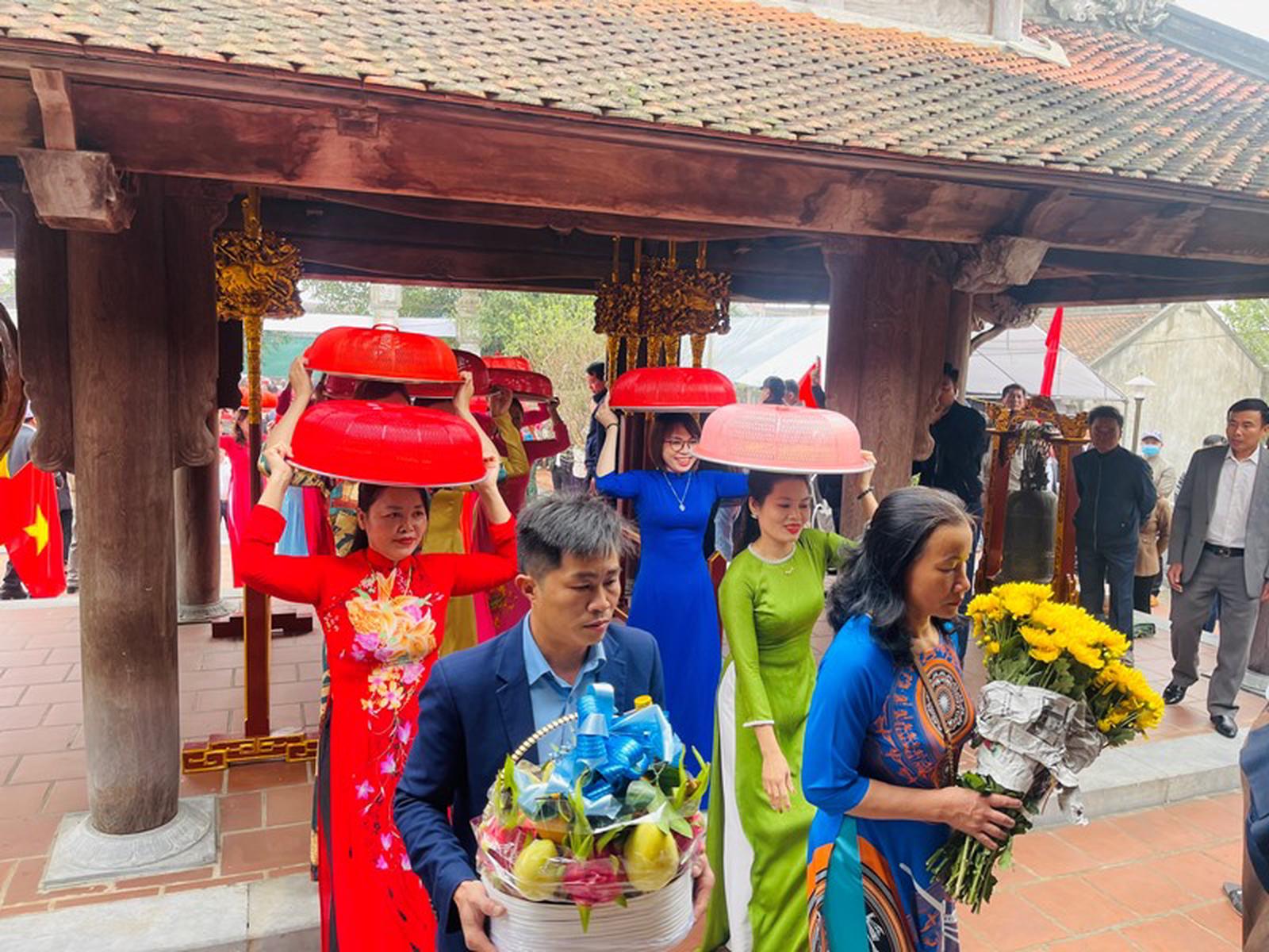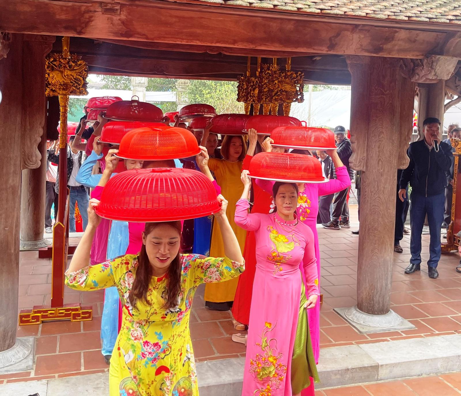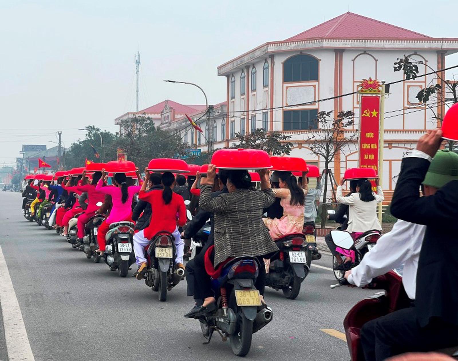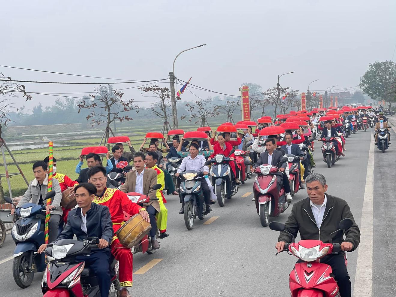 Người dân các thôn đội lễ đưa đến nhà thờ vua Mai Hắc Đế tại thôn Mai Lâm, xã Mai Phụ, huyện Lộc Hà. Ảnh: Hải Yến