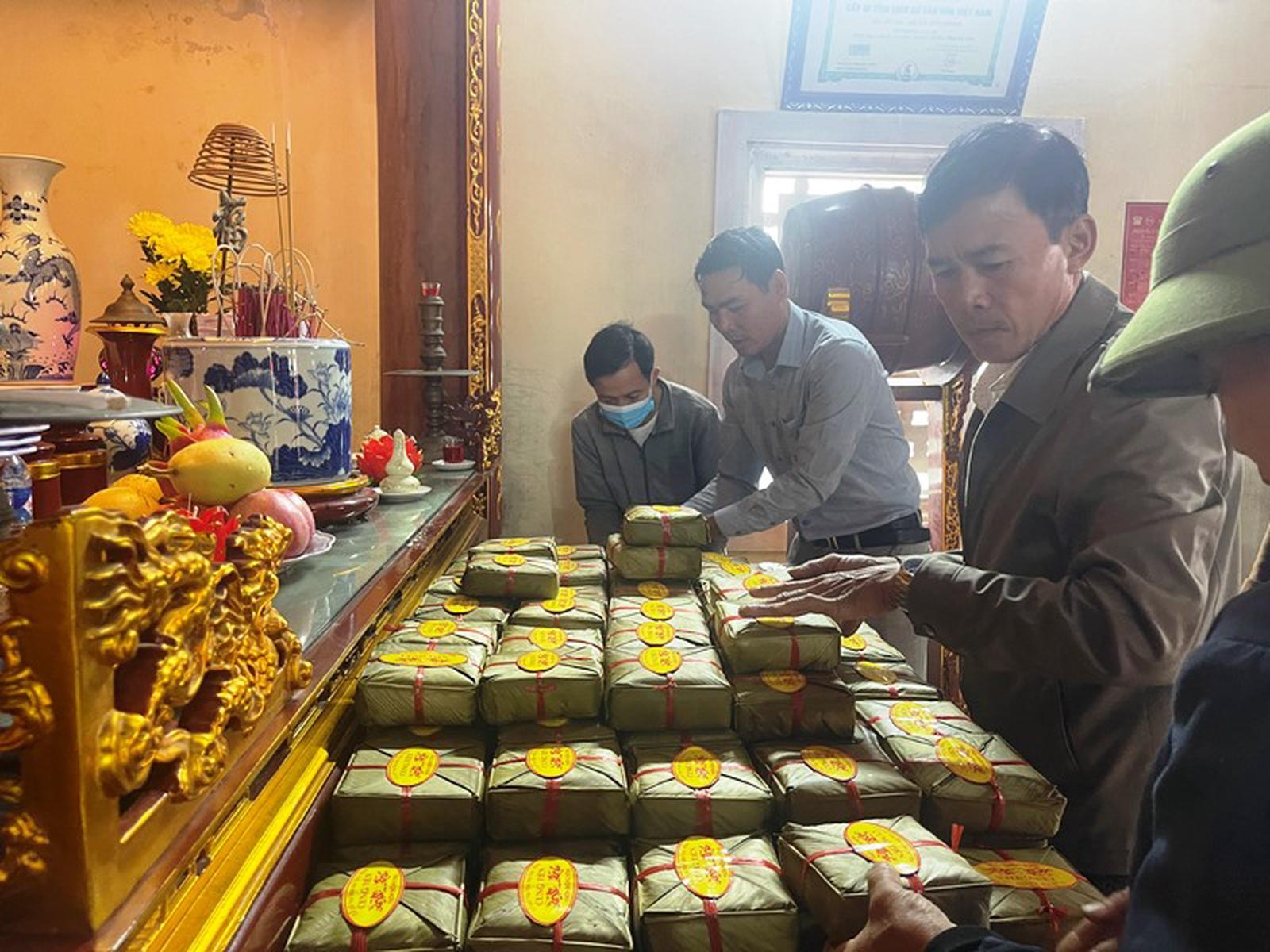 Năm nay, lễ giỗ được tổ chức với quy mô lớn, hơn 1.822 chiếc bánh chưng của người dân 7 thôn cung tiến lên bàn thờ vua Mai Hắc Đế nhân lễ giỗ 1.300 năm ngày mất của ông.