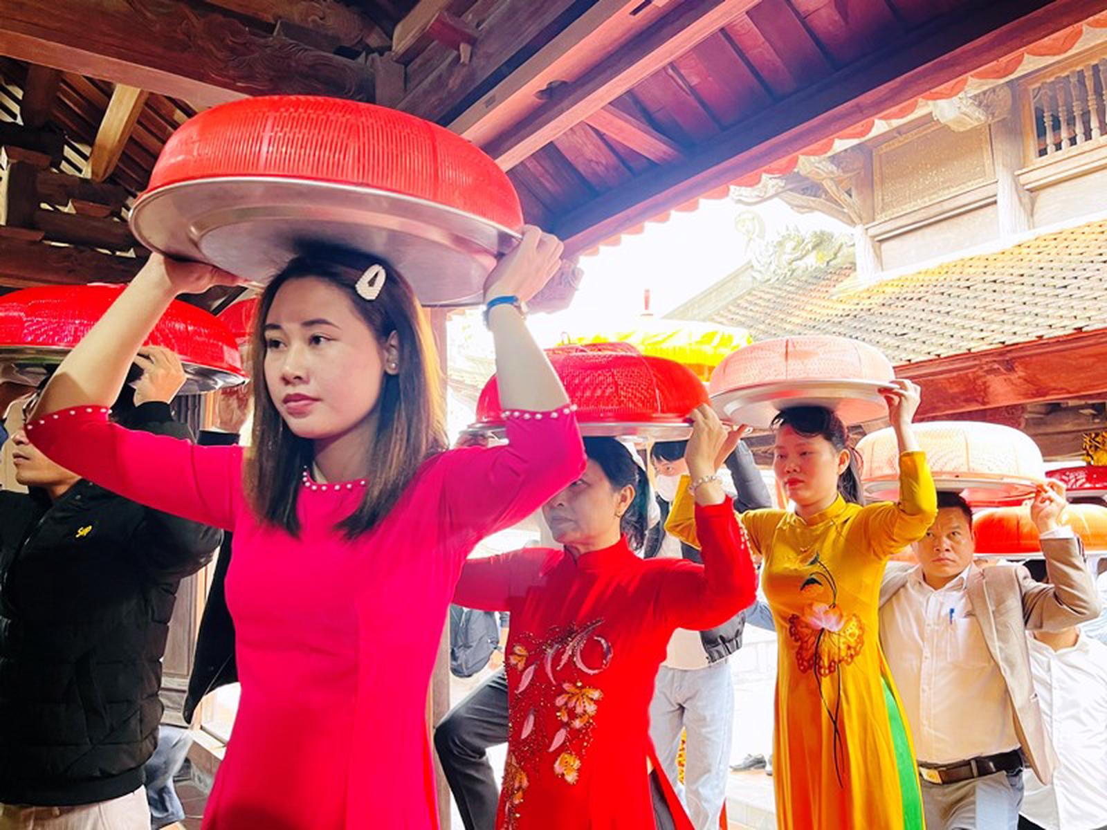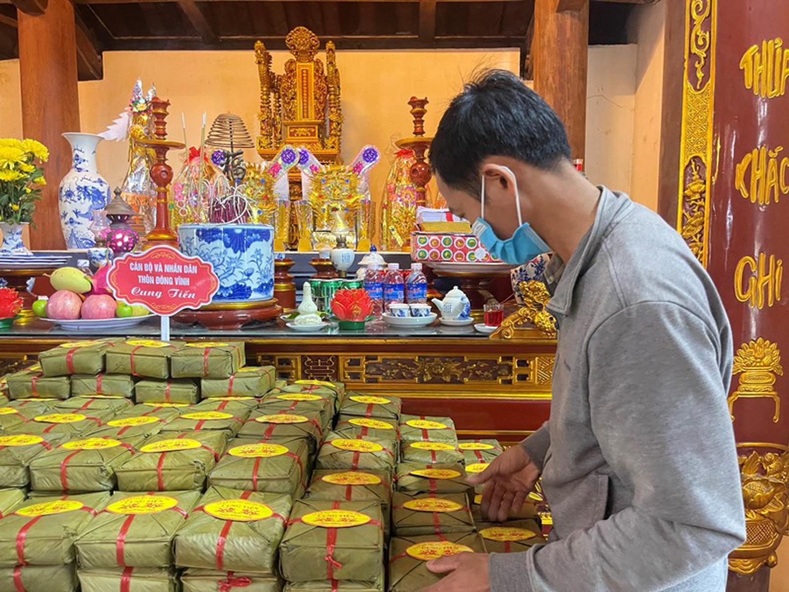 Ngoài bánh chưng, lễ vật dâng vua còn có hoa quả, xôi gà... Ảnh: Hải Yến Người dân thôn Sơn Phú đội lễ về nhà thờ vua Mai Hắc Đế. Ảnh: Hải Yến