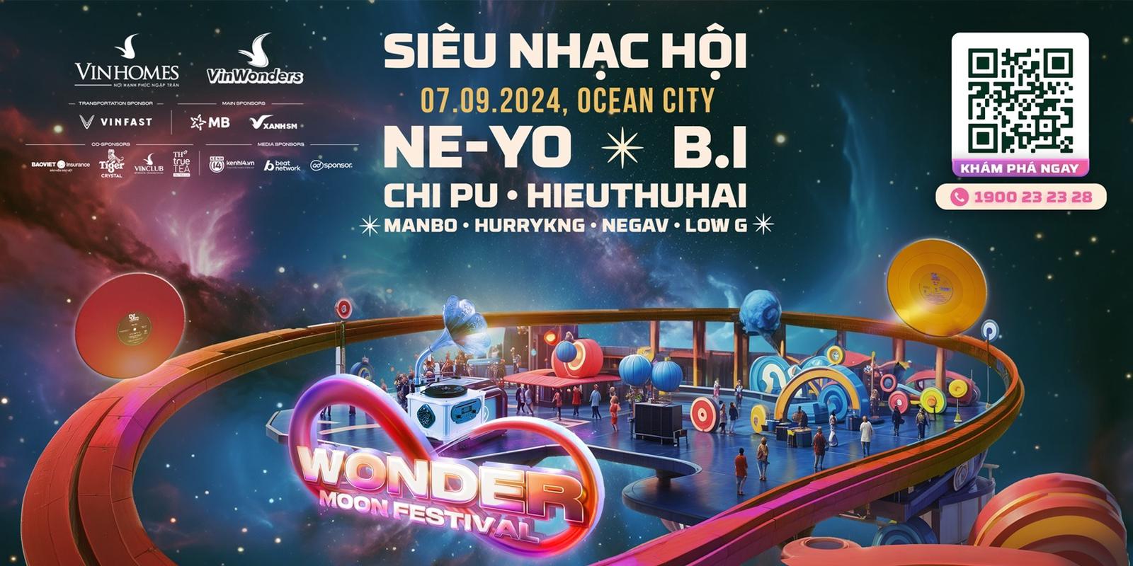 8WONDER MOON FESTIVAL - LỄ HỘI MÙA THU QUY MÔ CHƯA TỪNG CÓ Siêu nhạc hội quốc tế 8WONDER mùa 3 sẽ được tổ chức tại Ocean City - “Thành phố điểm đến mới” phía đông Hà Nội vào ngày 7/9/2024, trở thành sự kiện âm nhạc đầu tiên của Đông Nam Á quy tụ cùng lúc hai ngôi sao đình đám US-UK và KPOP: NE-YO - chủ nhân của 3 giải thưởng GRAMMY® danh giá và rapper nổi tiếng Hàn Quốc B.I. cùng các nghệ sĩ hàng đầu VPOP. Bên cạnh đó, 8WONDER Moon Festival còn mang đến lễ hội mùa thu quốc tế kéo dài xuyên suốt 3 ngày từ 6/9/2024 - 8/9/2024. Du khách được trải nghiệm mùa thu vàng Châu Âu với thông qua lễ hội ẩm thực mùa thu Italia, lễ hội Beer Land, EDM Orchestra Fest kết hợp trình diễn thời trang, trình diễn nghệ thuật đường phố, “Vũ trụ sống xanh” Greeniverse… Lễ hội mùa thu Hà Nội và các nước châu Á cũng được tái hiện trọn vẹn thông qua lễ hội ẩm thực Hàn Quốc, gian hàng trải nghiệm văn hoá Hàn Quốc, lễ hội Trung thu Việt Nam, con đường đèn lồng điều ước Jinju... Các hoạt động thể thao, giải trí như đại chiến thế giới nước, thể thao biển, pool party, Ocean Youth Camp sẽ hoàn thiện hành trình trải nghiệm đa tầng cảm xúc dành cho du khách tại Ocean City tháng 9 này. Vé 8WONDER Moon Festival đã có bán trên các kênh online chính thức: 👉 Trên website 8thwonder.vn | vinwonders.com | ứng dụng VinWonders 👉 Trên ứng dụng VinID 👉 Trên các nền tảng KKday | Klook Để biết thêm thông tin, vui lòng liên hệ: Website: https://8thwonder.vn/ Fanpage: https://www.facebook.com/8wondermusicfestival Tiktok: https://www.tiktok.com/@8wonder.official Xin trân trọng cảm ơn đơn vị đồng tổ chức: Vinhomes; nhà tài trợ chính: Ngân hàng Quân đội MB và thương hiệu XanhSM; đơn vị tài trợ di chuyển chính thức: VinFast; các đơn vị hợp tác tài trợ: Heineken, TH true TEA; đơn vị tài trợ bảo hiểm chính thức: Bảo hiểm Bảo Việt cùng các đơn vị bảo trợ truyền thông: BEAT Network, Kenh14, Adsponsor đã đồng hành cùng chương trình.