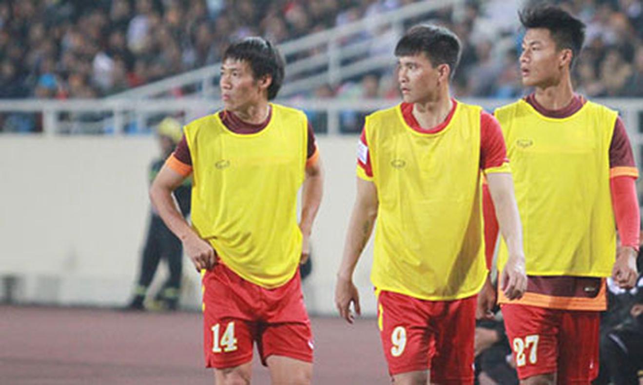 Tấn Tài (số 14) và Công Vinh (9) đều phải ngồi dự bị trong trận ra quân tại AFF Cup 2014. Ảnh: Lâm Thỏa