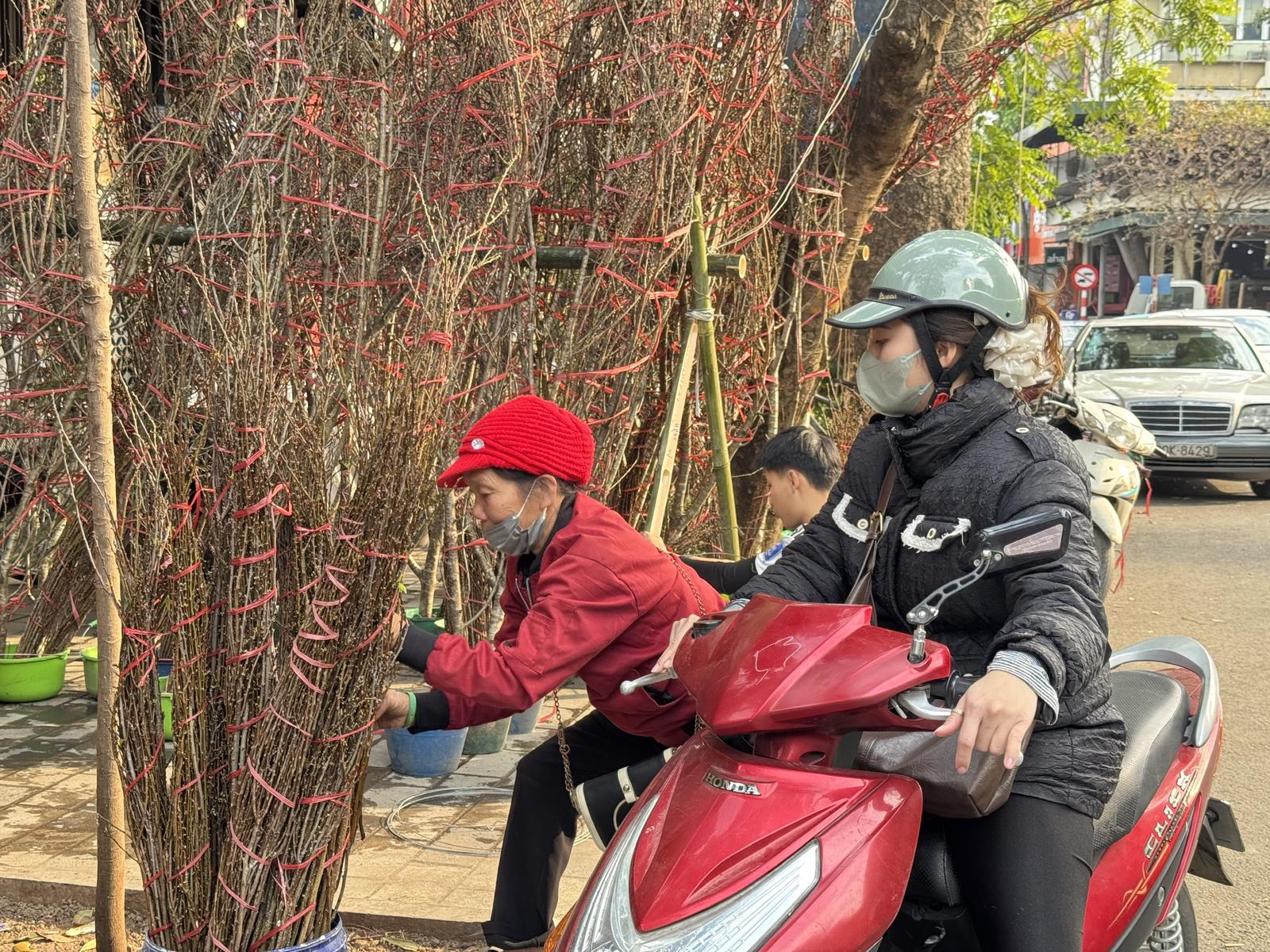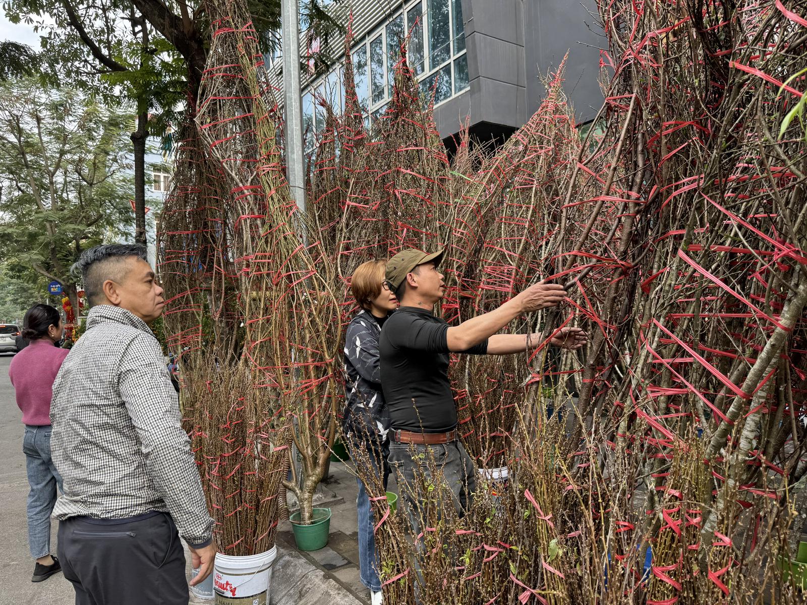 Tại đường Lạc Long Quân chiều 16/1, bà Thu Hiền cùng con gái tần ngần đứng ngắm cành đào rừng được chuyển về từ Sìn Hồ (Lai Châu) về, nhưng giá cành đào hơi đắt so với năm ngoái nên bà còn đắn đo.