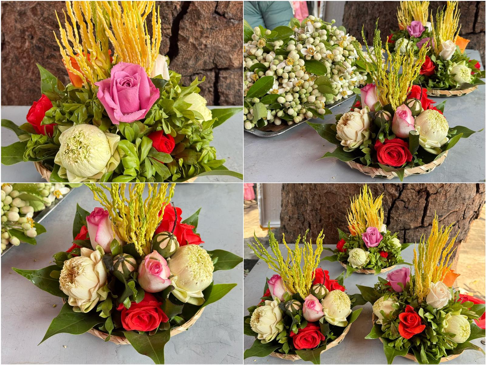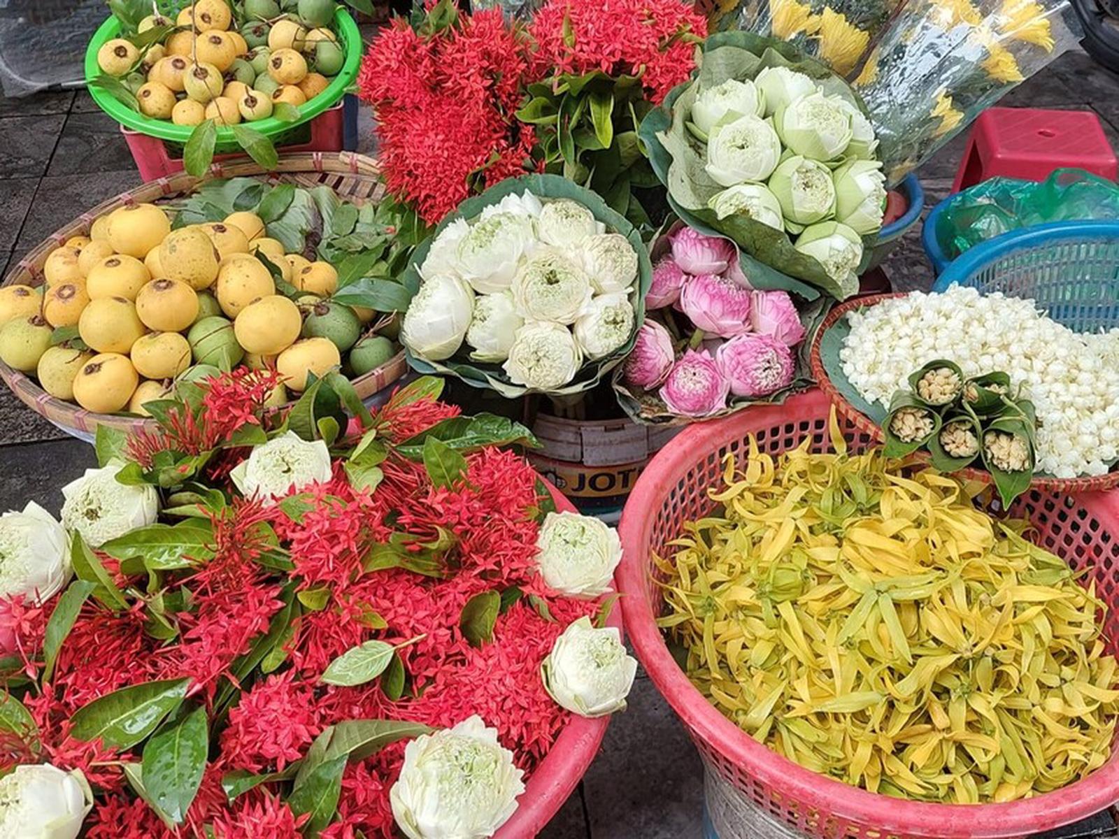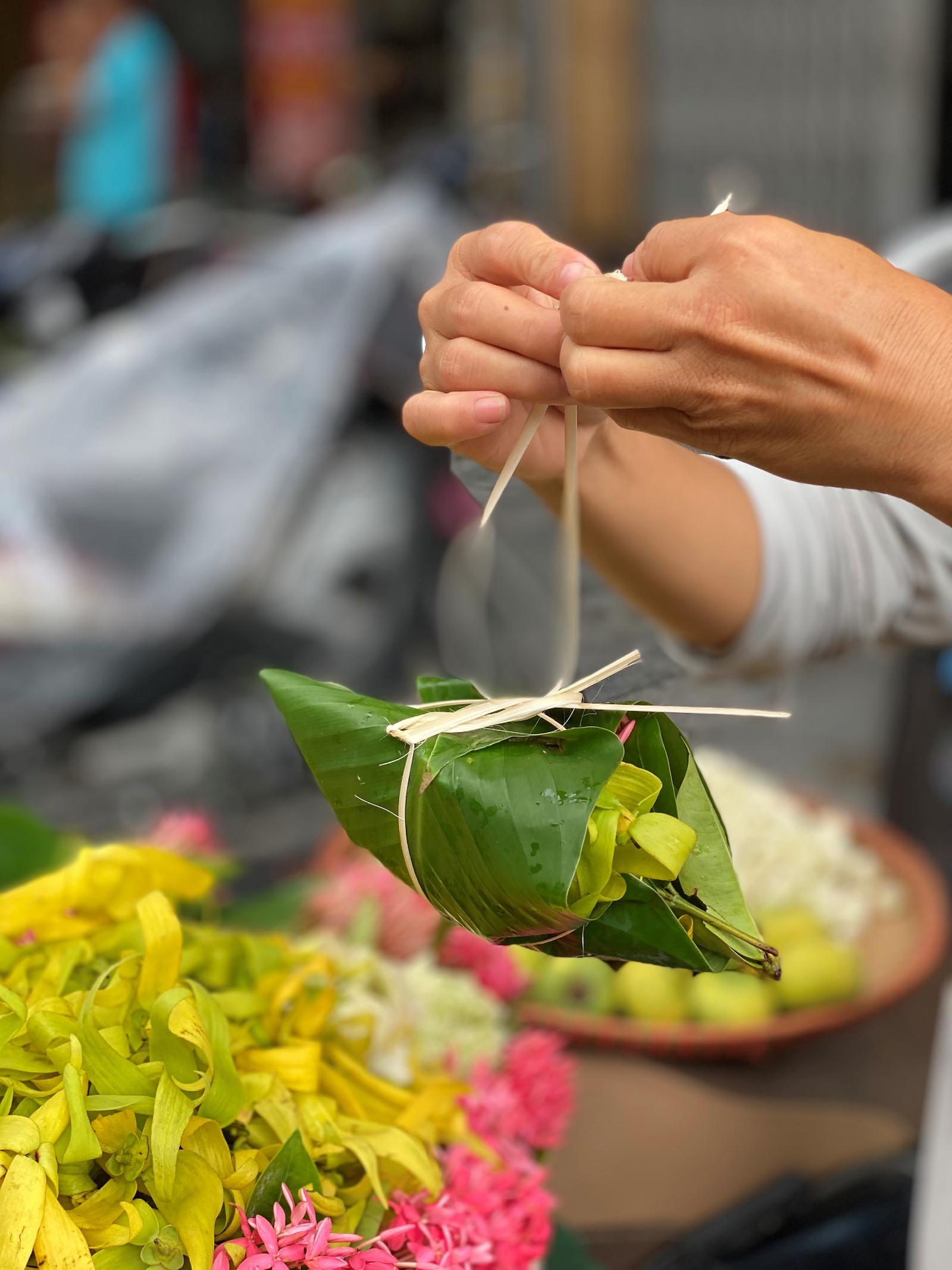 Những bàn tay nhanh thoăn thoắt nhẹ nhàng của người bán hoa cúng nhón nhặt từng bông hoa các loại như: Ngọc lan, hoàng lan, hồng, quế, cúc vạn thọ, ngâu, và cúc bạch nhật, cúc chi chi, hoa móng rồng... thơm ngát được gói gọn trong những tấm lá dong xanh ngát rất khéo léo, với những sợi lạt buộc vuông vắn hình chữ thập có dây để xách, vừa kín mà lại vừa chắc chắn để làm sao cho hoa không bị dập nát.