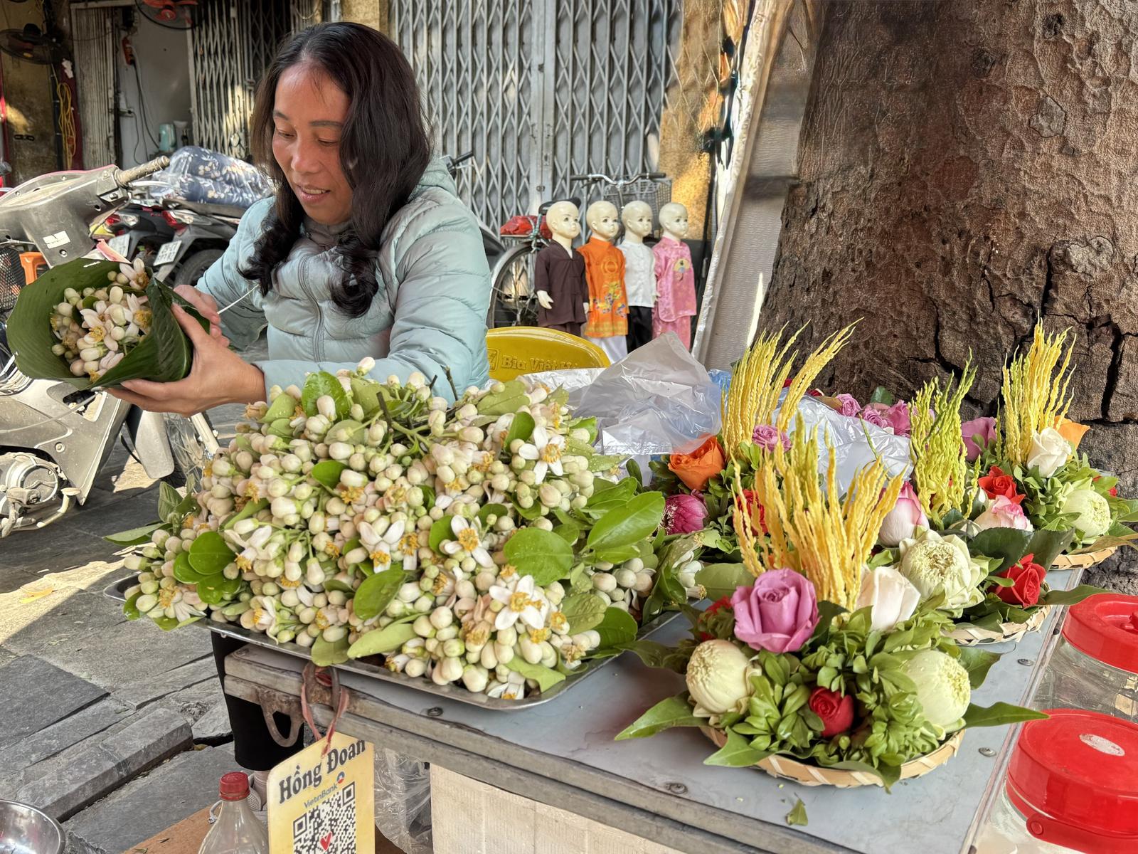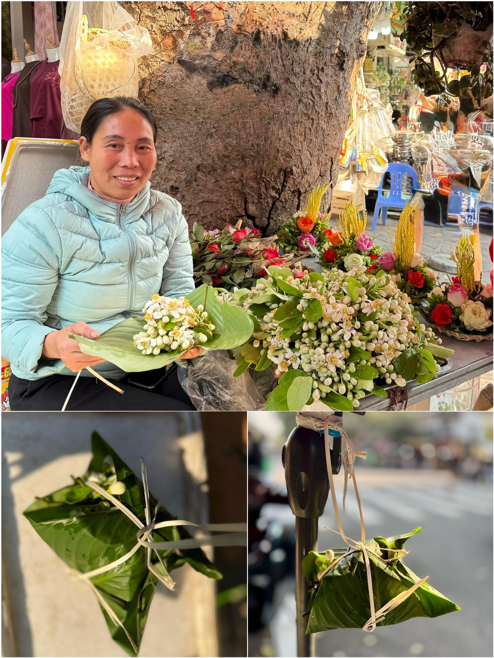 “Các cụ xưa thường xem trọng hương thơm thanh nhã và giàu ý nghĩa mà trân trọng dâng cúng tổ tiên. Hoa theo mùa chỉ cắt ngắn lấy đầu bông, được gói khẽ khàng trong chiếc lá dong bồ tát, buộc cọng lạt hình chữ thập rồi lại xỏ một vòng nữa, tết thành cái quai để xách. Đó là nét đẹp tao nhã, đời thường của người Hà Nội xưa được lưu truyền đến nay”, bà Hồng nói rồi lại thoăn thoắt đôi tay gói hoa bưởi cho khách.