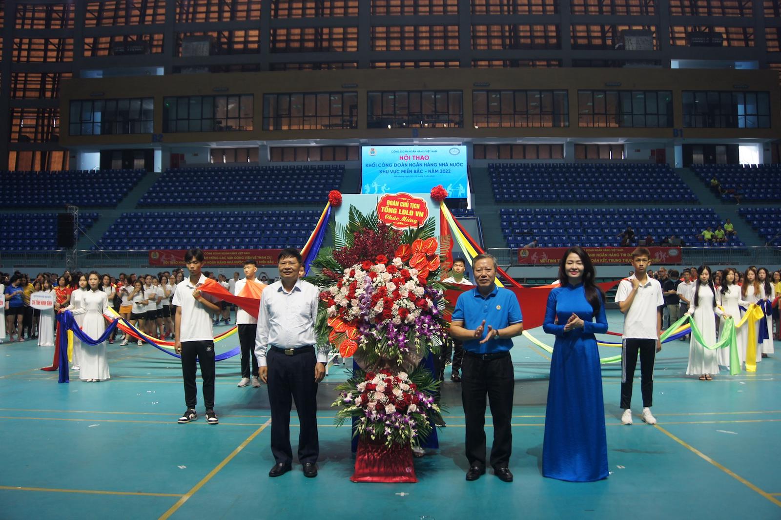 Phó Chủ tịch Thường trực Công đoàn NHVN Nguyễn Văn Tân và Phó Chủ tịch Công đoàn NHVN Nguyễn Khánh Chi đón nhận lẵng hoa của UBND tỉnh Bắc Giang, Tổng Liên đoàn LĐVN chúc mừng hội thao.