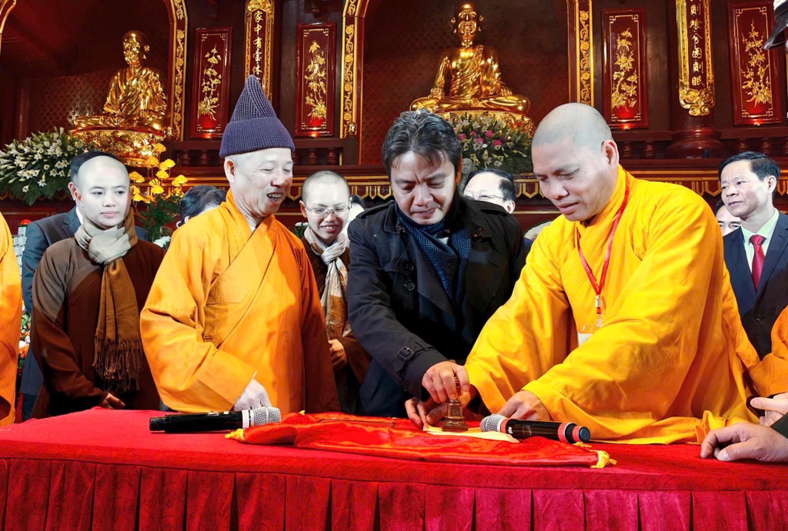 Thứ trưởng Bộ Văn hóa, Thể thao và Du lịch Hoàng Đạo Cương làm lễ đóng dấu thiêng Yên Tử. Ảnh: TTTT