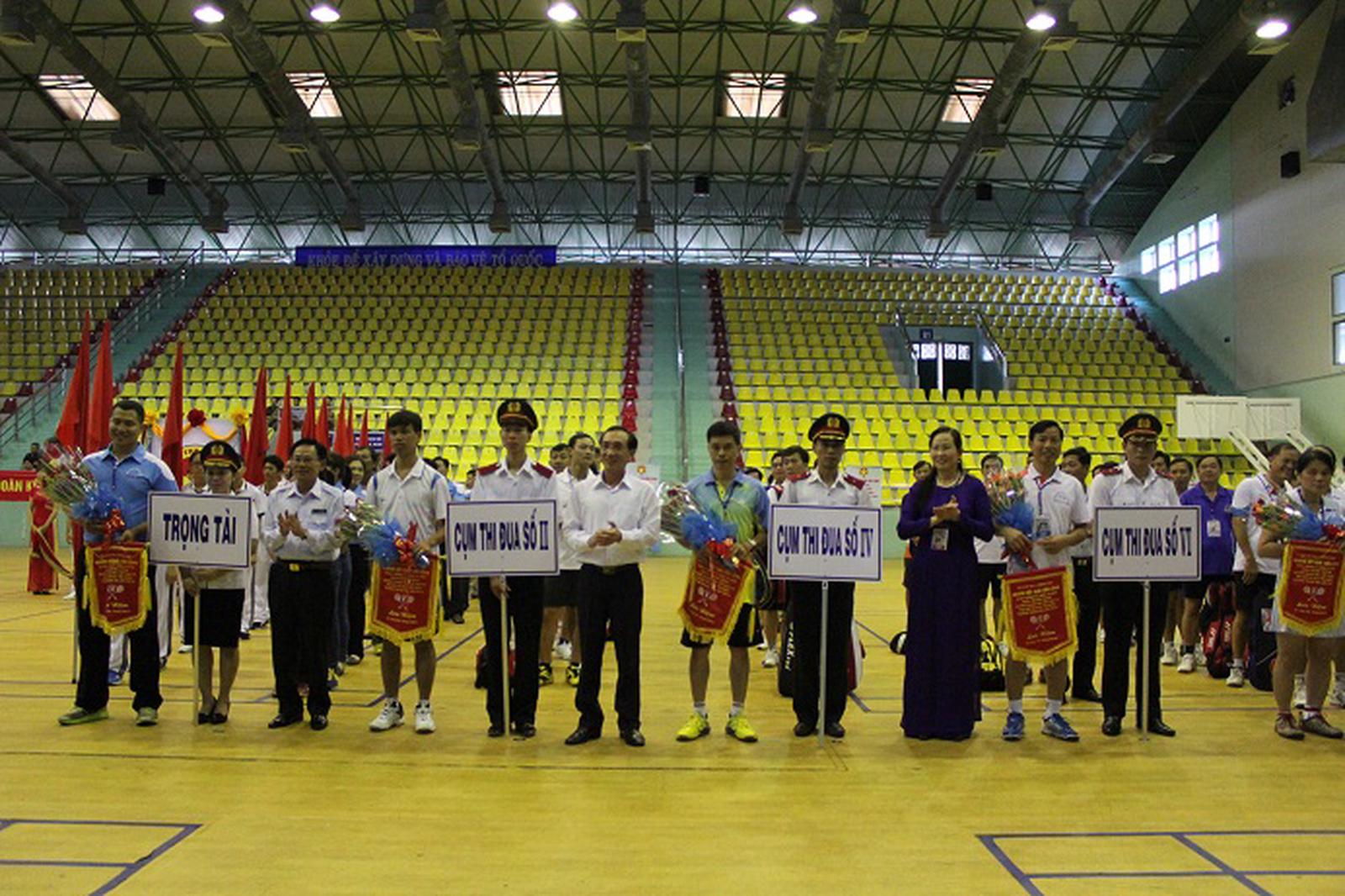 Tổng TTCP Huỳnh Phong Tranh và Phó Chủ tịch UBND tỉnh Bà Rịa - Vũng Tàu Nguyễn Thanh Tịnh trao hoa và cờ lưu niệm cho các cụm, khối thi đấu. Ảnh: TNG