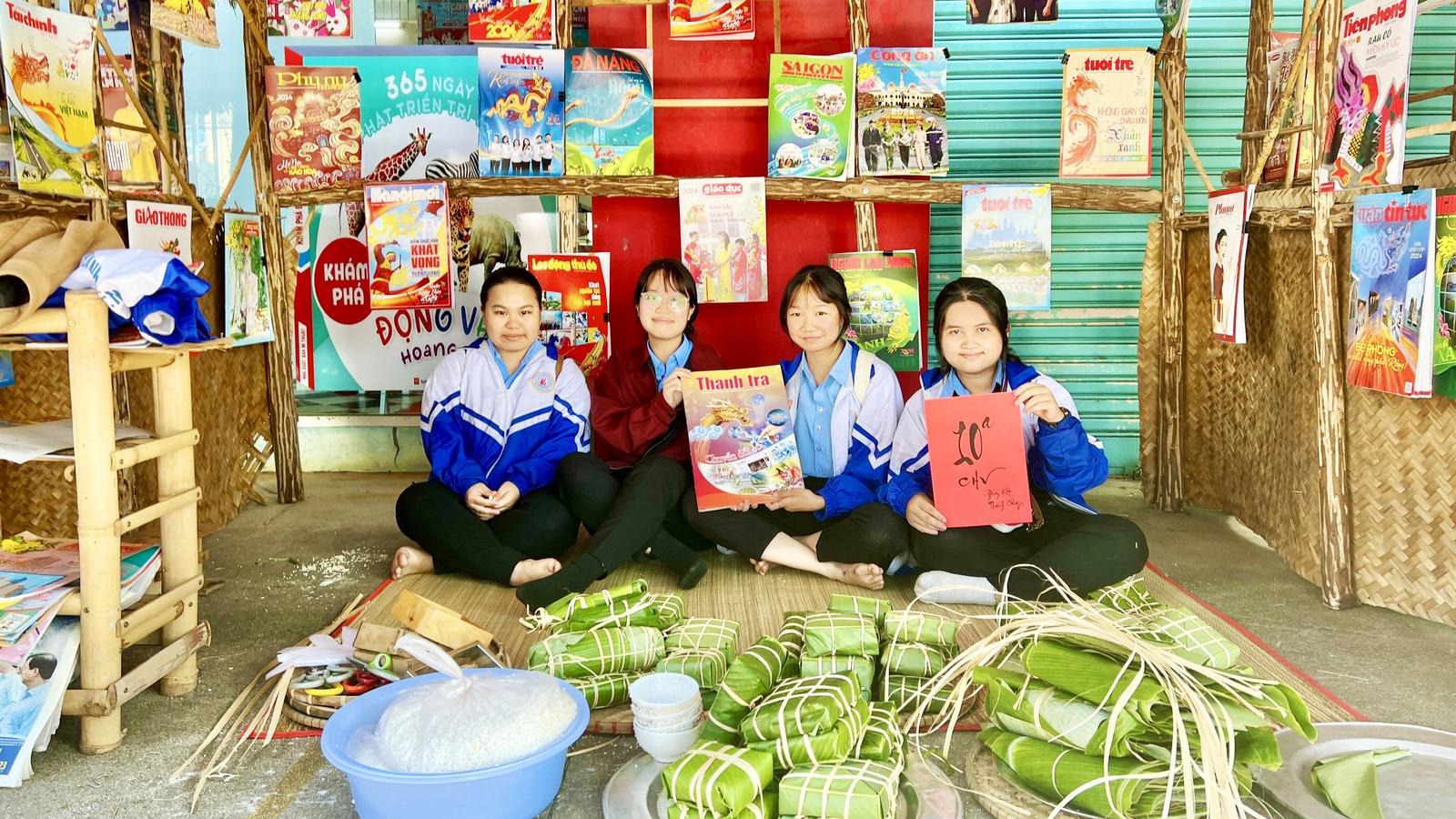 Các học sinh học tự tay gói những chiếc bánh chưng và tham gia các hoạt động, đọc báo tại Hội báo Xuân 2024. Ảnh: N.G