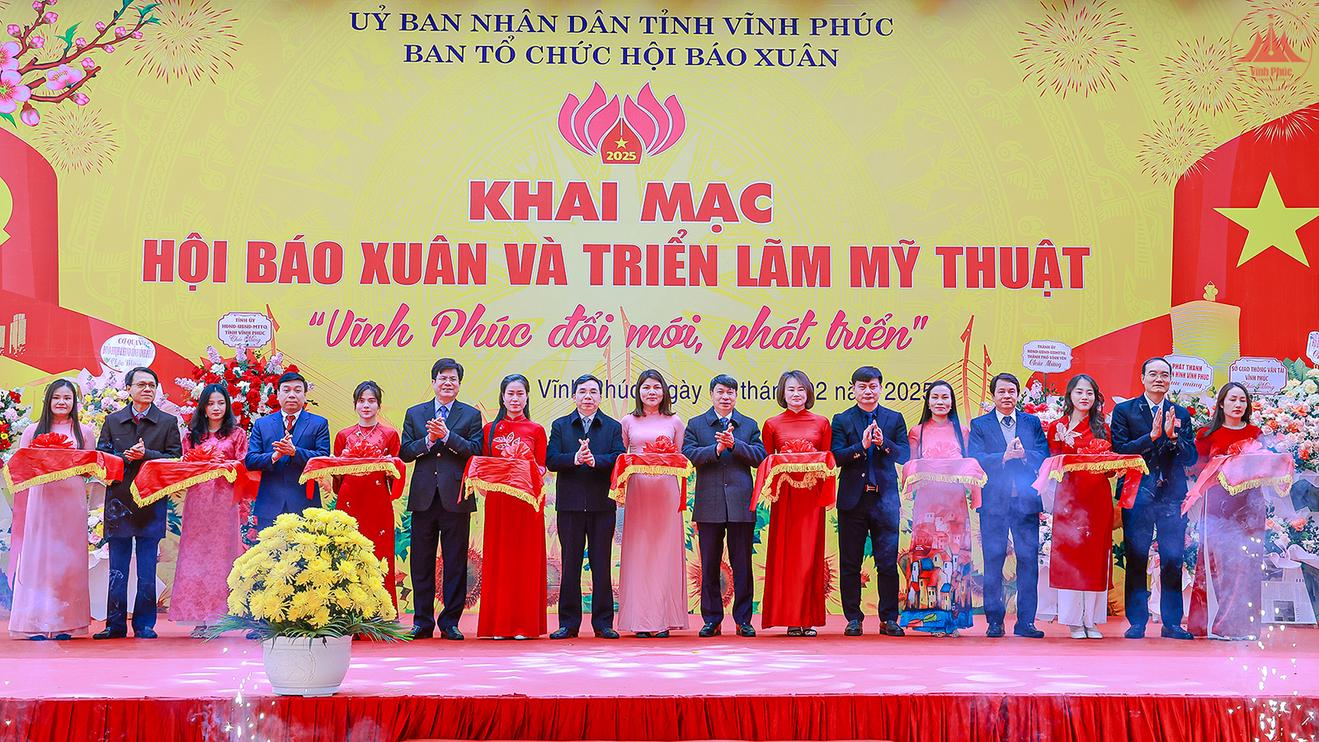 Các đại biểu cắt băng khai mạc Hội báo Xuân và Triển lãm mỹ thuật “Vĩnh Phúc đổi mới, phát triển”. Ảnh: Lê Mơ