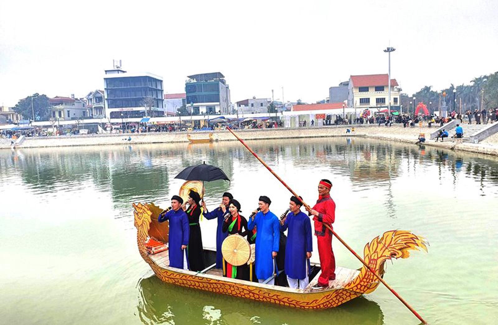 Hát Quan họ dưới thuyền tại hồ điều hòa Vân Tương mới được khánh thành trong sáng 2/2. Ảnh: HH