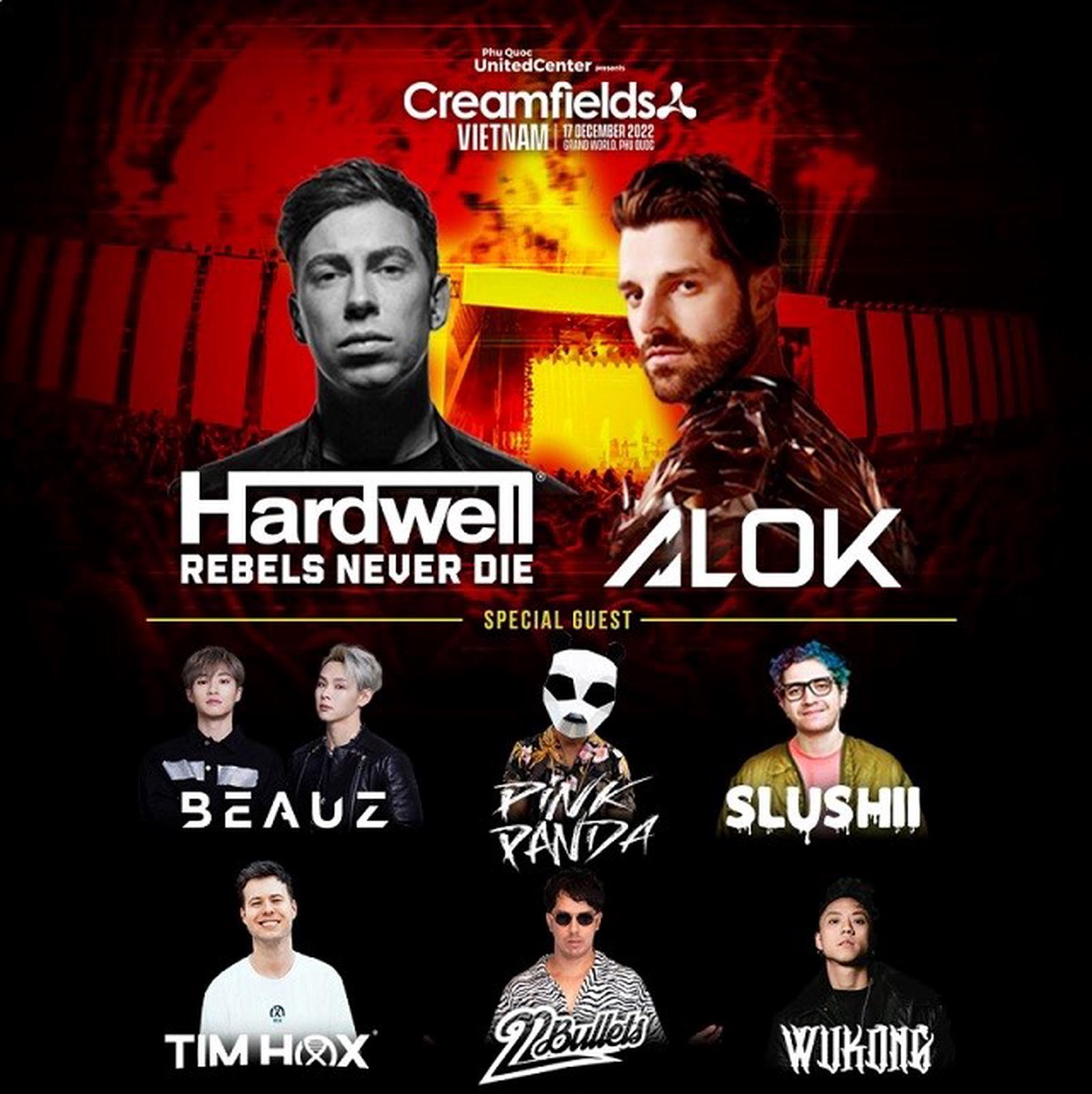 Hơn 10 giờ line-up liên tục, 10 DJ quốc tế hàng đầu như Alok, Pink Panda, Slushii, BEAUZ, 22Bullets, Wukong, Tim Hox… sẽ cùng nhau thổi bùng từng cung bậc cảm xúc của khán giả. DJ Top 4 thế giới Alok (do DJMAG bình chọn năm 2022) sẽ mang đến phong cách âm nhạc đã làm nên thương hiệu. Trong khi đó, DJ huyền thoại người Hà Lan Hardwell, cũng là người đặt nền móng cho EDM toàn cầu, sẽ chính thức quay lại sau 4 năm vắng bóng. Màn line-up của anh được đánh giá là đỉnh cao chưa từng có trong các lễ hội EDM khi sân khấu riêng “Rebels never die” của Hardwell được kết nối trực tiếp với không gian âm nhạc thời thượng của Creamfields.