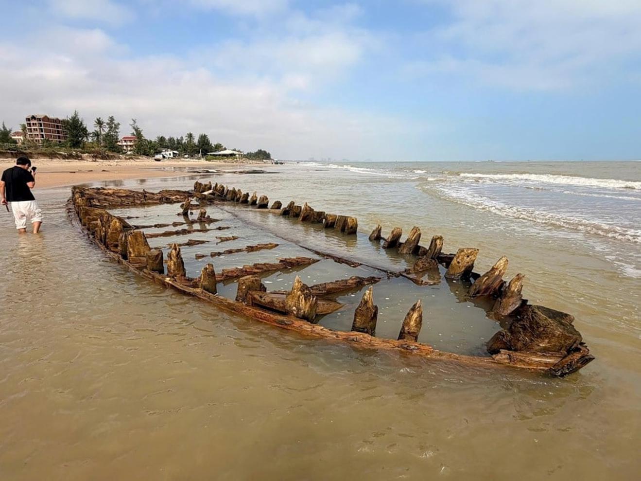 Tàu cổ phát lộ tại bờ biển Hội An. Ảnh: Q.Tuấn